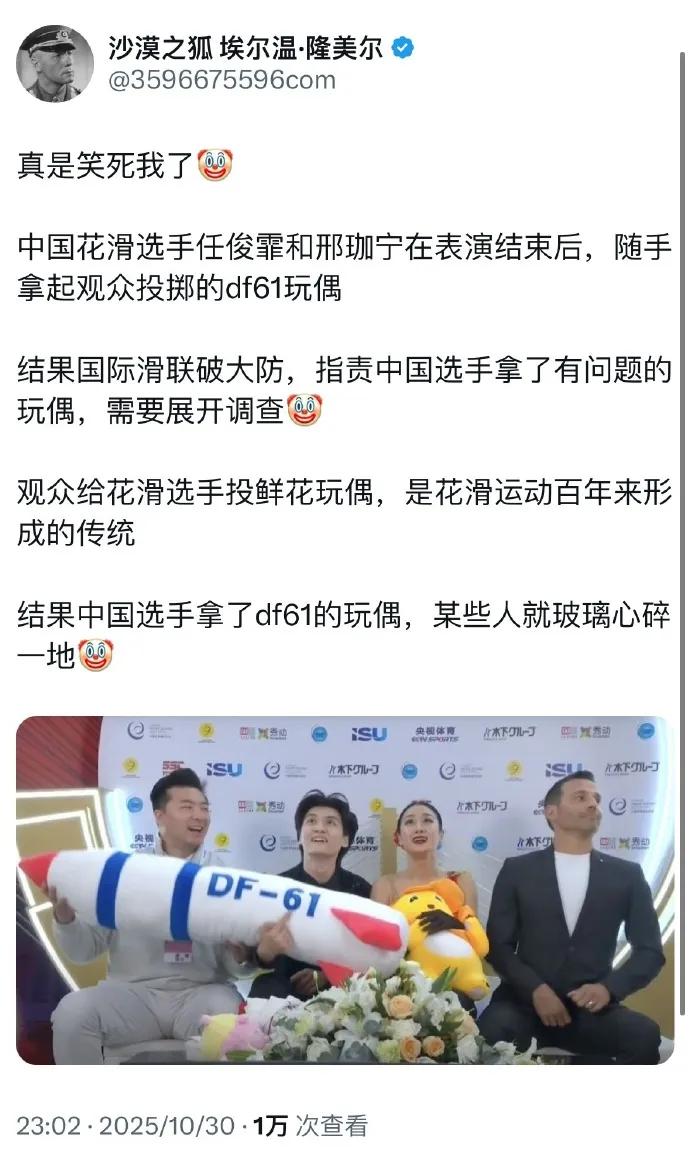 假如,美帝,日韩,欧洲运动员在你们举办的比赛颁奖现场,拿出类似物品,你们会如何应对?国际体育组织长期被美西方把持的时代应该结束了。这玩意在我们眼里就是玩偶,在破防的人眼里是索他命的黑白无常,西方这么小心眼,明显是贼眉鼠眼,风声鹤唳,草木皆兵啊。不过他们想多了,这世界98%的国家不值得、不配享用DF61。
