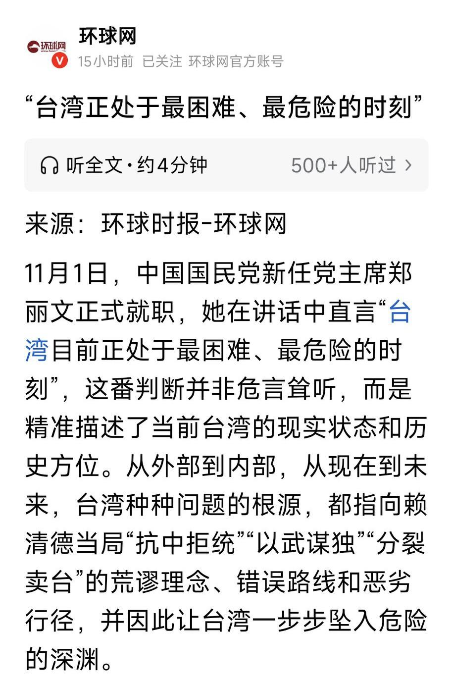 郑丽文:“台湾正处于最困难、最危险的时刻”!2025年11月1日,郑丽文接掌国民党,她直言“台湾正处于最困难、最危险的时刻”,这绝非危言耸听。赖清德当局“抗中拒统”“以武谋独”,让台湾陷入深渊。就说军购,2025年要花超80亿美元,占年度财政预算近15%,挤掉了建学校和医保补贴的钱。 台湾中时新闻网说得对,学以色列只会让军备竞赛掏空民生。而且半导体这根经济“顶梁柱”也被带偏,台积电美国工厂稀土库存仅够30天。“台独”行径把台湾推向危险边缘,希望郑丽文能带领国民党找到破局之路。
