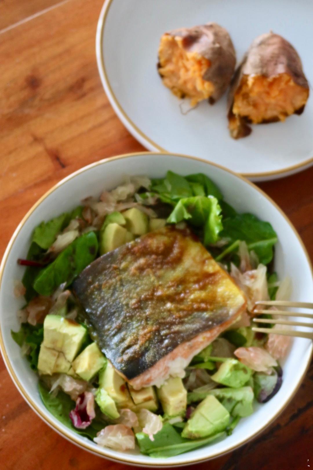 午餐:姜黄蒜粉初榨橄榄油低温烤三文鱼牛油果🥑沙拉沙拉,牛油果一买多就得赶紧吃;路易波士椰奶拿铁