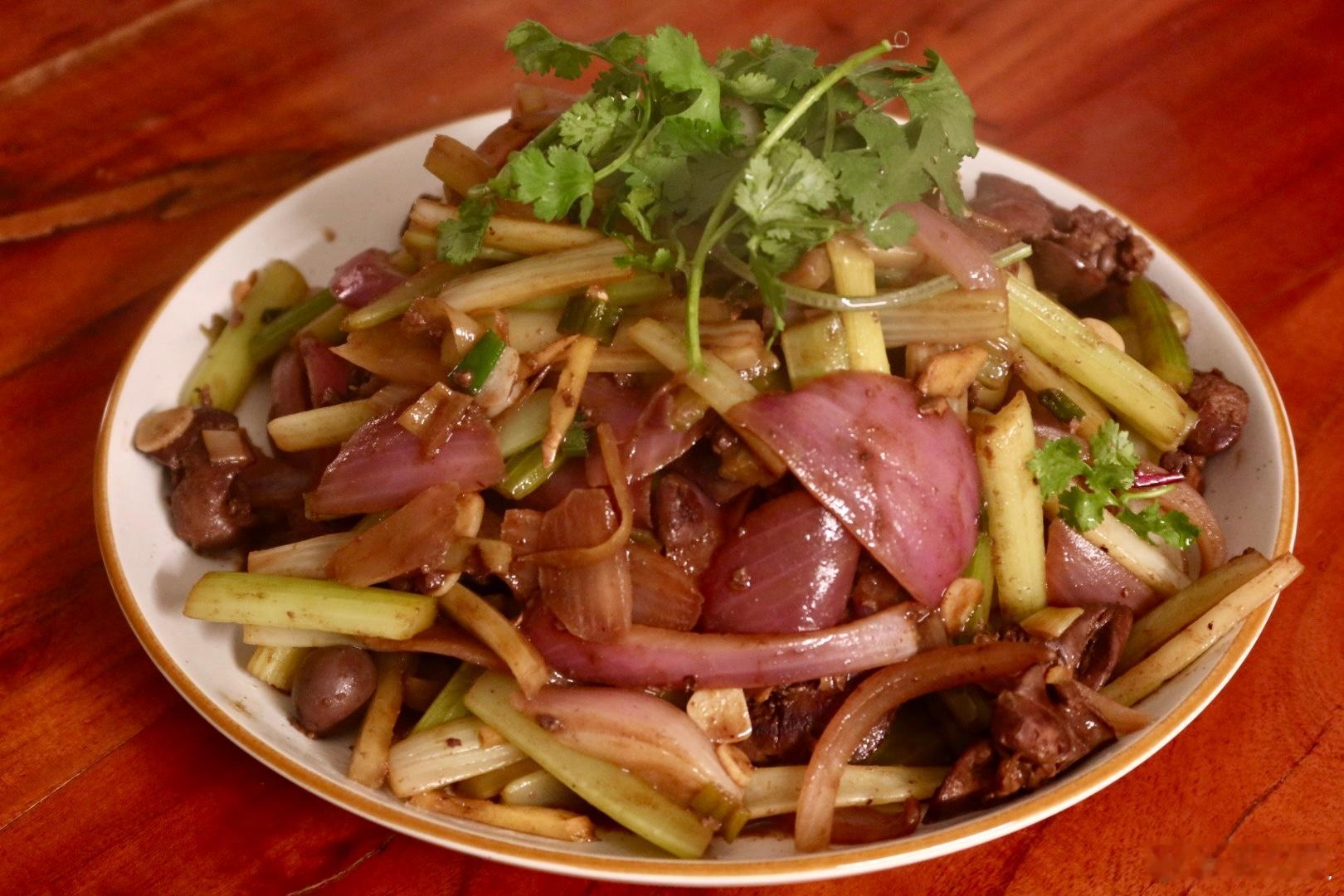 晚餐:洋葱西芹炒鸡肝。又解锁了一个食材——鸡肝!担心腥放了很多葱姜蒜去腥。看《你是你吃出来的》营养学科普书才知道肝脏富含各种维生素是超级好的东西,是以食代药的自然界多种维生素丸