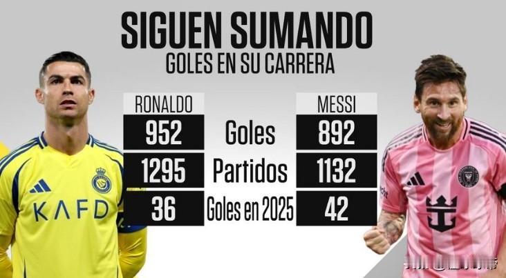 先胖不算胖,梅西2025年比C罗多进了6球! 在今年的比赛中,38岁的梅西打进了42球,40岁的C罗打进了36球,梅西比C罗多进了6球。但是先胖不算胖,好胖压倒炕,C罗即将很快超越梅西的进球。 因为今年剩余这两个月C罗还有十多场比赛要踢呢,而梅西如果在下一场美职联季后赛输球的话,本赛季就彻底结束了,今年也就再没有正式比赛可踢了,只剩阿根廷国家队的热身赛了。 因此C罗今年至少能打进50球以上了,超越梅西的42球只是时间问题了。在职业生涯总进球中,C罗目前打进了952球,梅西则打进了892球,两人还差60球了。