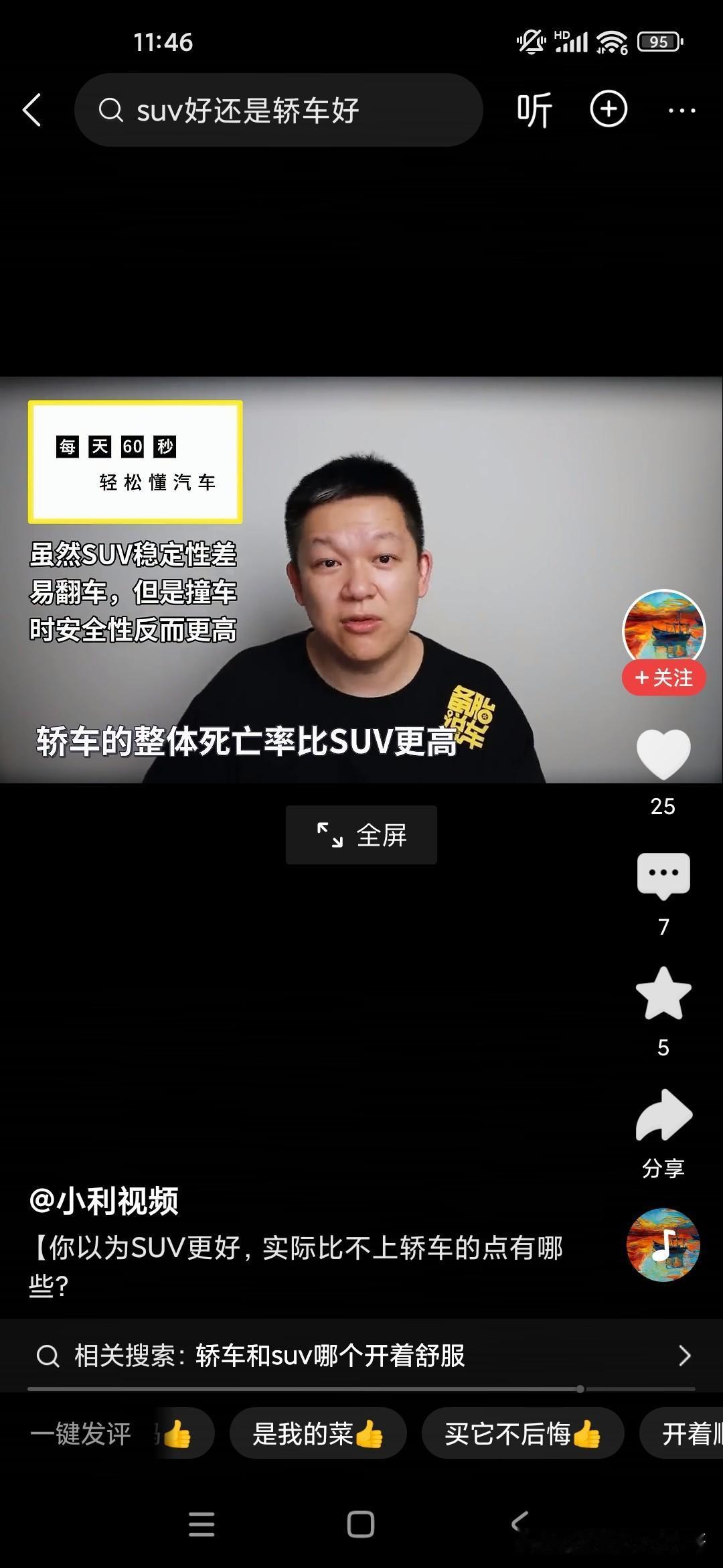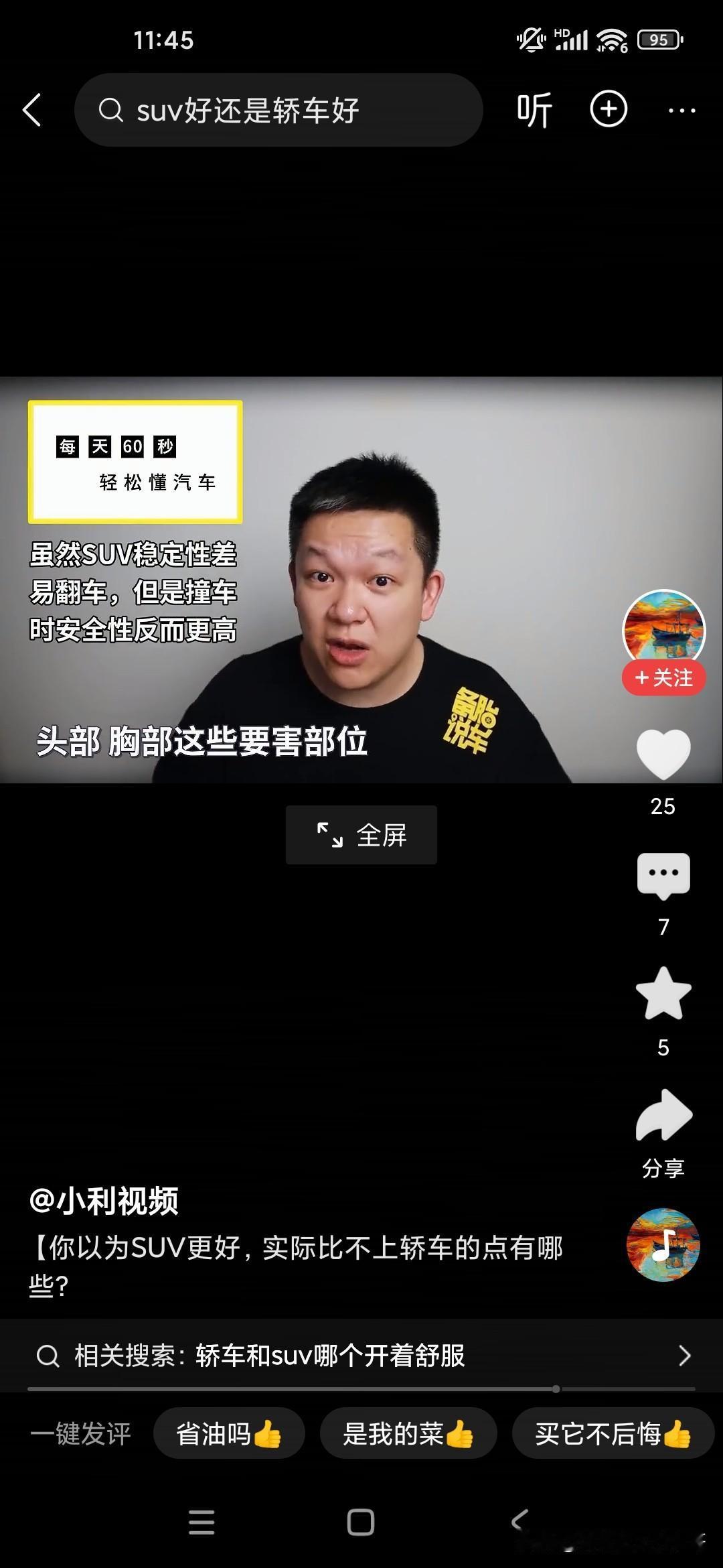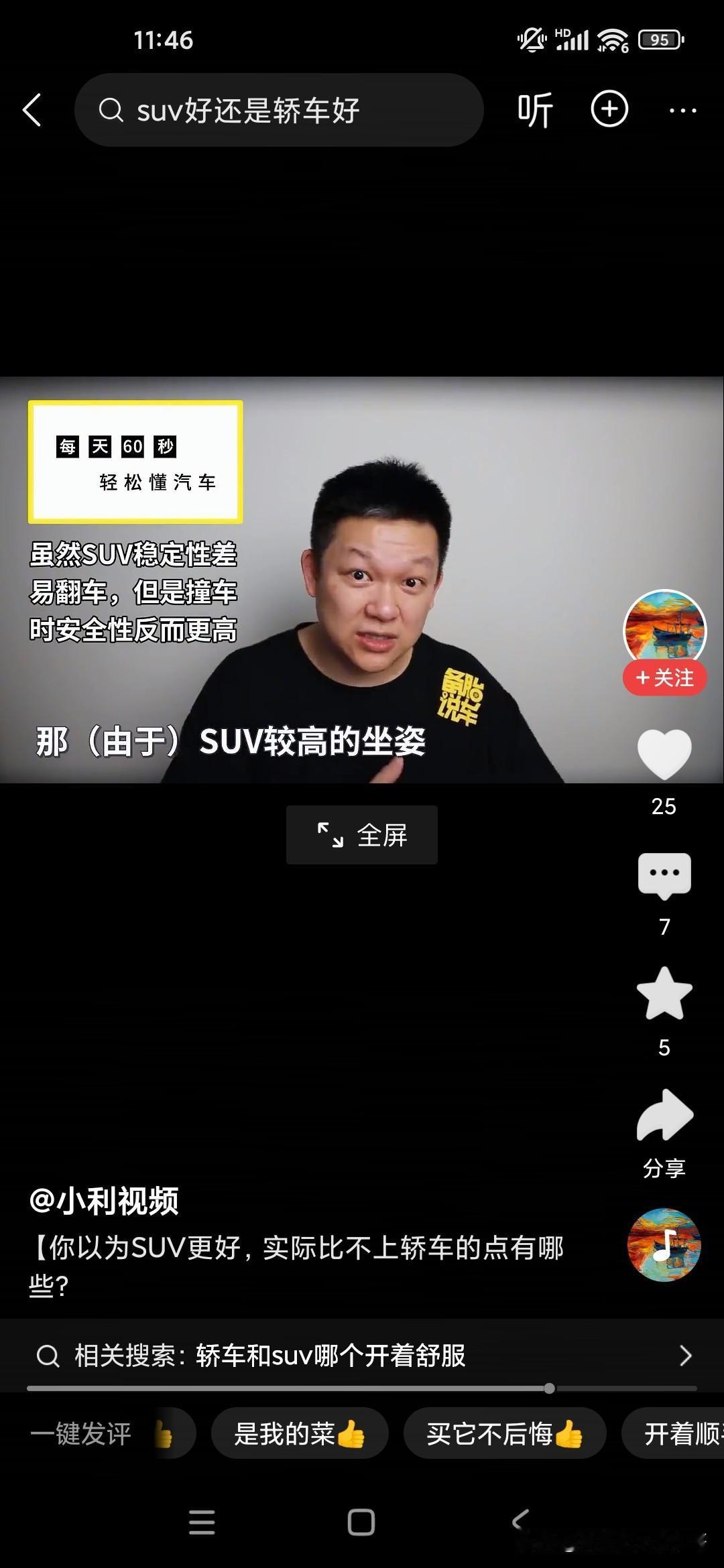 不知道你是不是更喜欢SUV,因为SUV车身比较大,装的行李比较多,通过性比较强,而且的话更加安全一些,因为你的座位更高一些,如果发生碰撞的话,可能一般来说不会伤到你上半身,我们主要是脑袋还有躯干这两个主要部位,其他的话都是四肢伤到的话也只是轻伤,但是如果一旦头部受到撞击的话,那肯定是受不了的,但是SUV的确也有它的缺点,耗油量比较大,因为车身比较大风阻比较大,第二的话是车身比较高,容易侧翻,第三的话是稍微慢一点,有的通过性也没有像想象中的那么大,当然看个人偏好,有的人喜欢稍微大一点的车辆看着比较气派,有的人喜欢稍微小一点的,油耗稍微小一点!完全看个人经济能力和个人喜好!