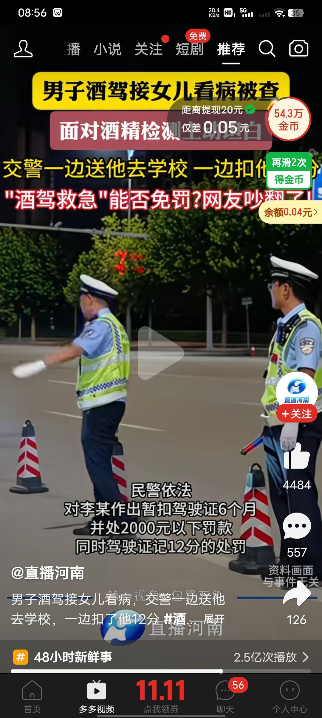 网友吵翻了,如果是你,你该怎么该怎么做?男子酒驾接女儿看病被查,面对酒精检测主动