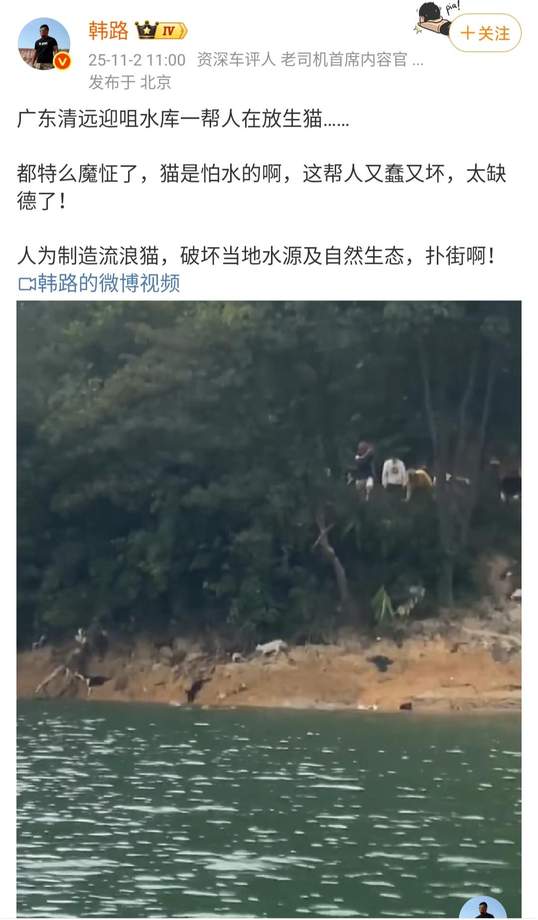 韩路:广东清远迎咀水库一帮人在放生猫…… 都特么魔怔了,猫是怕水的啊,这帮人又蠢又坏,太缺德了! 其实这几年关于放生的新闻也挺多的,比如还有非常离谱的把淡水鱼放在海水里面。 小编那里还发生过更离谱的,把蛇类放生在水库里面,然而那个种蛇类并不是当地的品种,最后志愿者消防抓了几天。 各位是怎么看的?欢迎评论区留言。