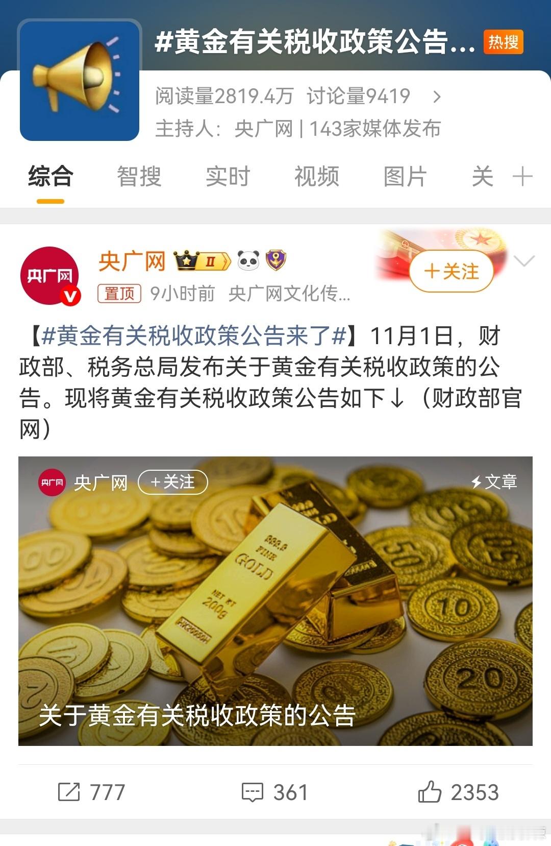 黄金有关税收政策公告来了 沃仔细看了一下公告,沃的理解是:一、以后投资黄金通过交易所(上海黄金交易所、上海期货交易所)税方面有优惠很低。二、通过实物投资黄金税费成本会很高,比如金店的首饰银行的金条要卖出会增加交易成本。三、为什么这样?沃觉得郭嘉希望人们投资黄金通过交易所交易,这样有个好处:上海黄金交易所交易量会持续大增,以后就能超过伦敦的黄金交易所,以后咱们就有希望能掌握黄金的定价权。