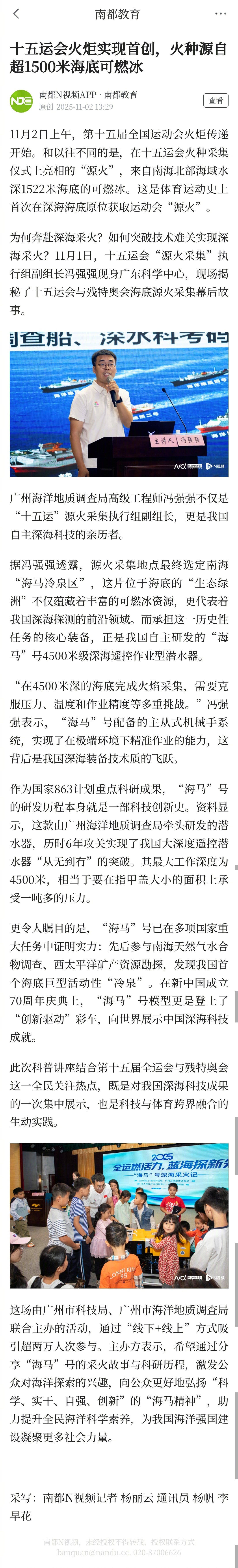#十五运火种源自1522米海底可燃冰#【十五运会火炬实现首创,火种源自超1500米海底可燃冰】#十五运火种采自南海海马冷泉区#11月2日上午,第十五届全国运动会火炬传递开始。与以往不同的是,在十五运会火种采集仪式上亮相的“源火”,来自南海北部海域水深1522米海底的可燃冰。这是体育运动史上首次在深海海底原位获取运动会“源火”。