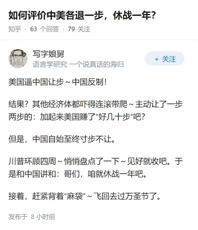 中场休息,整饬军备,积蓄力量,下半场一决生死。中美磨刀霍霍,你可以赌一赌他们会向谁?休战一年,能坐下来谈说明双方实力旗鼓相当,谁也没把握干掉对方,只能先暂时休战一年,在这一年内,重整旗鼓,准备再战。中美双方都是有声有色的大国,强国,都不可能在任何一场战争中彻底打垮对方,都是百足之虫,死而不僵。双方都必须要做好持续斗争的准备,还有第三势力虎视眈眈,双方必须要时刻保持斗而不破的状态,除非一方有绝对的实力彻底碾压对方,不然都会是点到为止,不断损耗对方国力。