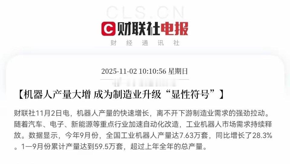 受益于工业机器人产量大增的直接利好,叠加板块估值修复需求,预计明日机器人板块将迎来强势表现,投资者可重点关注相关核心标的机会。