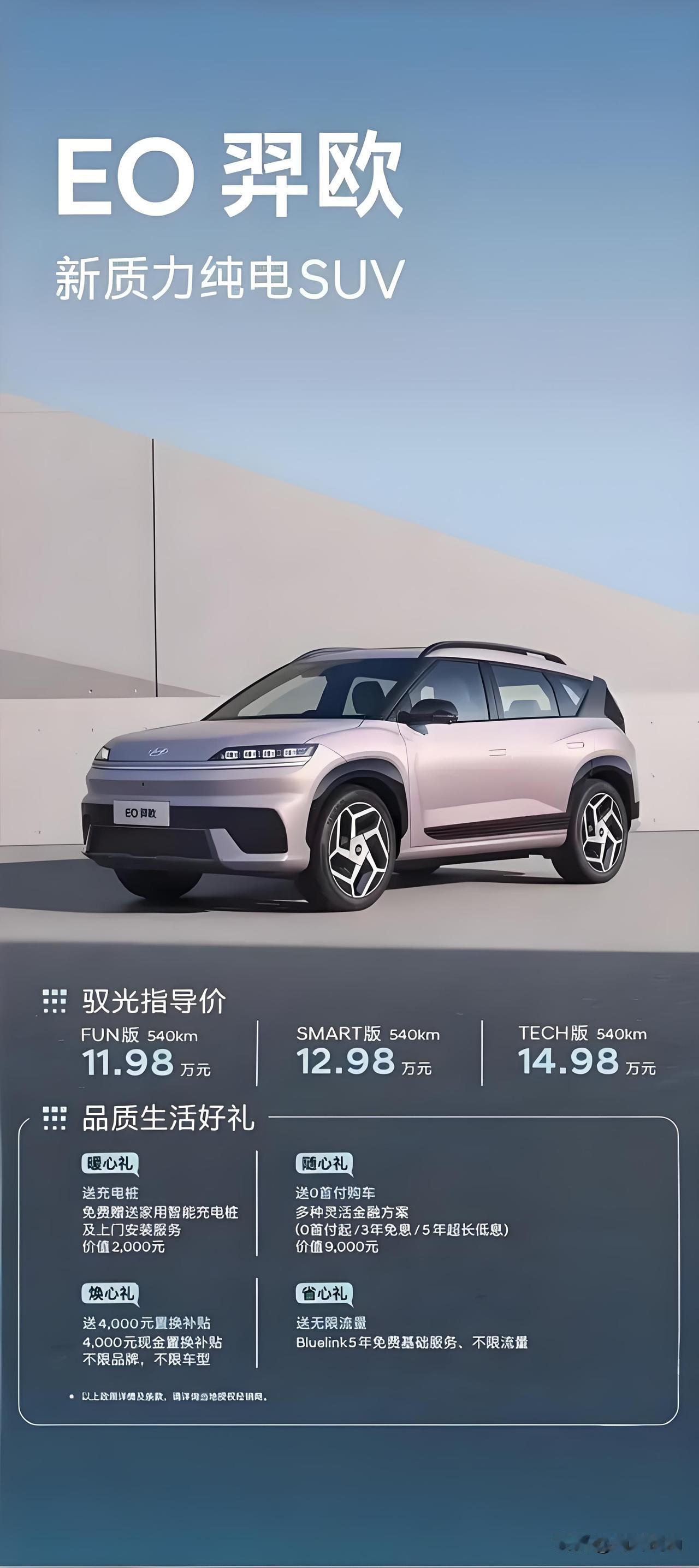 在15万级别的合资纯电SUV中,它或许给不了你风驰电掣的激情,却像一位贴心的伴侣,稳稳融入你的家庭日常。 作为北京现代首款纯电SUV,EO羿欧走的是不拼参数、不玩噱头的路线。它更在意那些高频又实用的功能,一切从真实用车场景出发,在这个价位里,反倒带来一股清新之气。 目前EO羿欧提供三个版本,有前驱和四驱可选,电池容量也有区分,照顾到不同用户的实际需要。其中我最推荐两驱版和四驱Tech版。 虽然是入门款,两驱版的配置可一点不“入门”。全系标配杜比全景声音响,一上车就像被音乐包裹,听歌观影都足够沉浸。中控那块23英寸超薄大屏,分辨率达到4K级别,画面细腻生动,UI设计也清新流畅,用起来很顺手。 它还搭载了“赛博之眼”抬头显示,对比度高达30000:1,清晰度出色。哪怕迎着强光行驶,关键信息依然一目了然,让你目不离路,驾驶更安心。 底盘方面,EO羿欧采用前麦弗逊、后多连杆搭配全框式副车架的结构。电机最大功率160千瓦,续航540公里,应对日常通勤、周末近郊出行绰绰有余。北京现代作为国际大厂,底盘调校功底扎实,行驶质感稳定而舒适。 不过要说最令人心动的,还得是四驱Tech版。它在15万级合资车中罕见地搭载了双电机四驱,最大功率提升至230千瓦,驾驶质感在同级中可谓独树一帜。 悬挂仍是前麦弗逊后多连杆结构,但额外配备了四个SFD自适应减震阀。它们像一群敏锐的路面感应器,自动调节阻尼,轻松化解颠簸。无论山路还是城市破损路面,车内始终平稳,乘坐体验仿佛高级别车型。 前排座椅不仅支持通风加热,还藏着一个贴心设计:一旦开启运动模式且车身侧倾超过6度,座椅侧翼会立刻收紧,把驾驶者稳稳包裹住。激烈操控时,这份安全感来得刚刚好。 日常实用配置也考虑得很周到。车内配备两个50瓦无线充电板,手扶箱有三个Type-C口,后排还有两个,全车人充电都不用争抢。 北京现代EO羿欧或许不是最快的纯电SUV,却懂得如何成为家庭中那个靠谱的存在。它不张扬,却总能给你恰到好处的陪伴与安心。