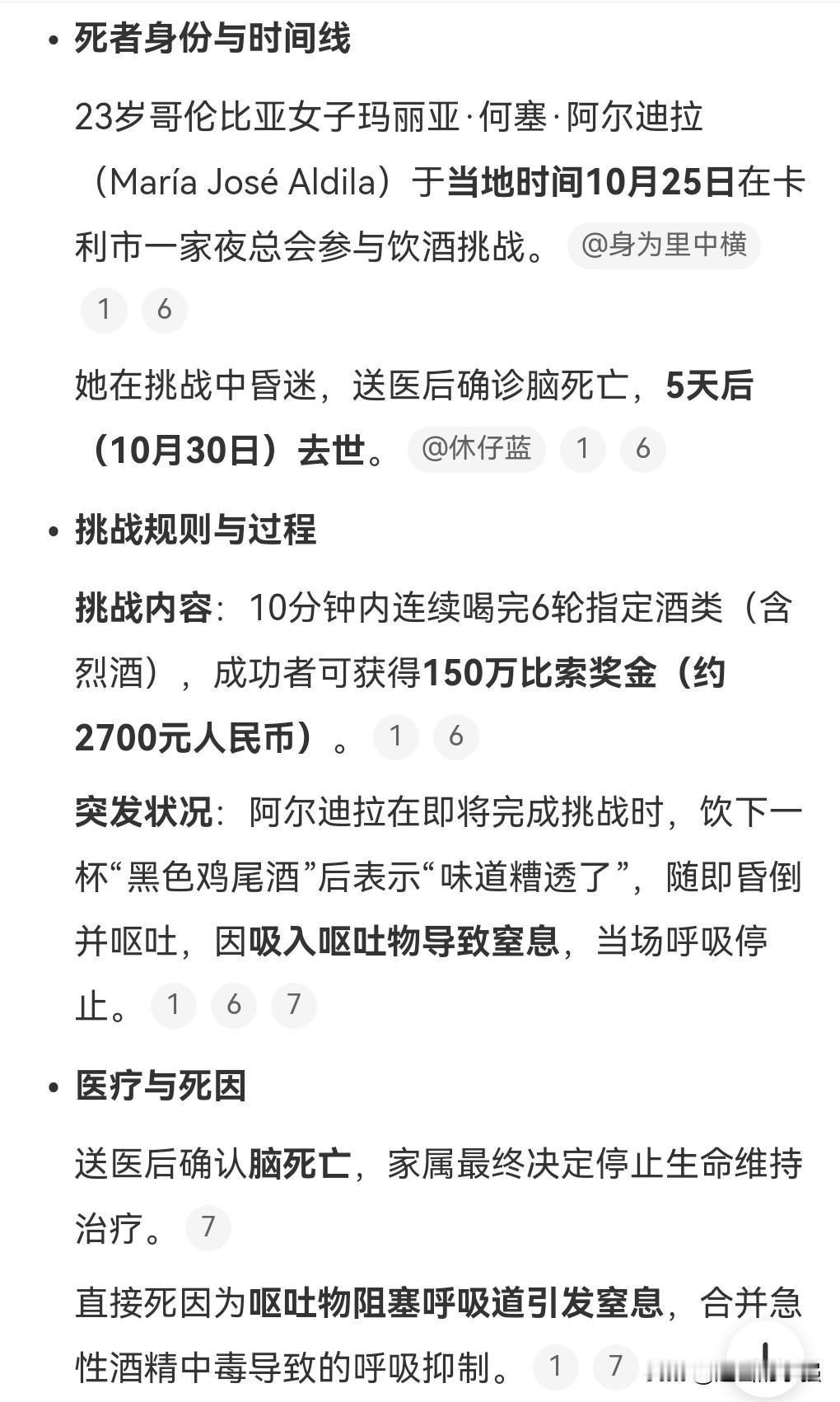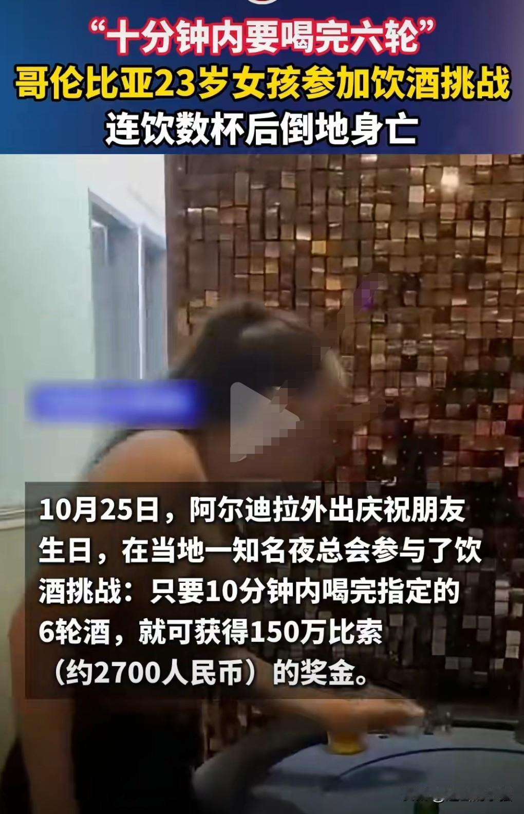 竟然搞这种丧心病狂的比赛,喝酒挑战,规定在一定时间内喝多少酒,奖2700块人民币这么少。 近日,哥伦比亚23岁女孩参加饮酒挑战身亡,这真是太得不偿失了。 所以说不要喝太多酒。 对身体没什么好处。
