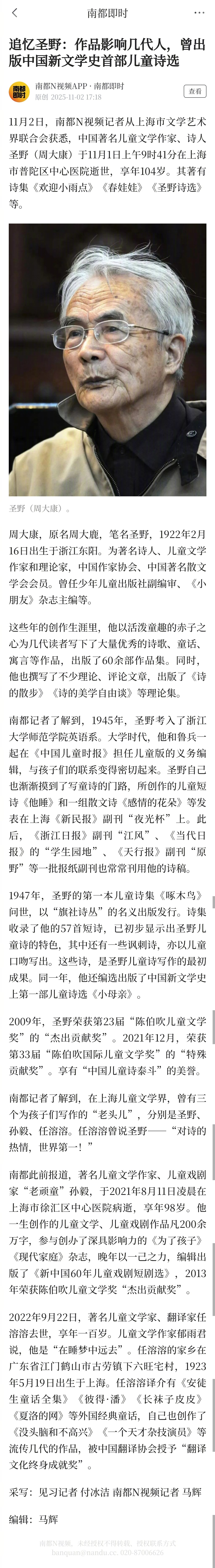 #著名儿童文学作家圣野去世#【追忆圣野:作品影响几代人,曾出版中国新文学史首部儿童诗选】#上海儿童文学界三个老头儿均已去世#11月2日,南都N视频记者从上海市文学艺术界联合会获悉,中国著名儿童文学作家、诗人圣野(周大康)于11月1日上午9时41分在上海市普陀区中心医院逝世,享年104岁。其著有诗集《欢迎小雨点》《春娃娃》《圣野诗选》等。