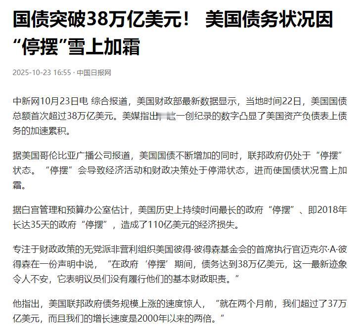 美债已经滚到38万亿了,为啥还没暴雷?说白了,美债已经出事了,只不过美国短时间内不会轻易倒下。美国现在的情况有点像温水煮青蛙,虽然水温在慢慢升高,但还能勉强适应。   这数听着就吓人吧?平均到每个美国人头上,一人得扛十一万多美金的债。可你看美国跟没事人似的,照样发新债还旧债,其实全靠全球还没彻底对它失去那点可怜的信任撑着,说穿了就是钻了全球金融的空子。   先说说美国的家底有多虚。2024财年的时候,美国光还国债利息就花了1万亿美金,比军费都多,在联邦预算里就排第二,仅次于社会保障支出。算下来一天光还利息就得30亿,这钱够一个中等国家花一整年了。   更要命的是,未来十年这利息还得涨到14万亿美元,比搞研发、修基建、办教育的钱加起来都多。可美国政府还在疯狂发债,2025年10月国债刚破38万亿,两个月前才刚到37万亿,涨速是2000年以来的两倍。   这就跟你欠了一屁股高利贷,每天光还利息就压得喘不过气,结果还在接着借钱一个样。那美国凭啥这么横?答案就一个:美元霸权。全球做买卖,差不多一半都用美元;各国央行手里的外汇储备,美元虽说降到56.32%了,但还是老大。   说白了就是全世界都得用美元办事,手里的美元没地方花,只能买美债,哪怕知道这是个坑,也得硬着头皮跳。就像你家楼下小卖部只收一种奇怪的代金券,你明知道这券可能越来越不值钱,也得捏着鼻子用。   更绝的是美国还能自己印钱买自己的债。美联储去年偷偷换了个玩法,把到期的房贷相关证券换成短期国债,直接从市场上接了1万亿美元的新债。这就是左手倒右手,用新借条还旧借条。这种操作虽说能解燃眉之急,可把风险全甩给了全球金融体系,跟你找邻居借钱还银行一个道理,暂时没人追债了,但欠邻居的钱早晚得还,利息还更高。   不过温水煮青蛙,总有煮不下去的时候。现在全球都在慢慢不用美元了,2025年二季度,各国央行手里的黄金储备第一次超过了官方持有的美债,达到3.86万亿美元。连印度、巴西这些新兴市场国家,都开始用自己国家的货币做贸易,不再全靠美元了。这就像你身边的朋友都开始拒绝你的代金券,改用别的货币交易,你的代金券自然就越来越不值钱。   美国国内的问题也不少。政府停摆、两党互相拆台都成家常便饭了。2025年10月国债刚破38万亿的时候,美国政府还在停摆,连最基本的财政决策都做不了。这种政治上的窝里斗,让投资者越来越没信心,穆迪、标普、惠誉这三大评级机构都下调了美国的信用评级,警告说这债务根本撑不下去。就像你开了家公司,老板和高管天天吵架,员工人心惶惶,客户自然就不愿意跟你做生意了。   最危险的是美国经济的“抵抗力”越来越差。过去几十年,美国靠科技革命、升级产业,一次次把债务危机扛过去了,可现在这些好处都快没了。制造业空心化、贫富差距越拉越大、生产效率也不涨了,美国经济越来越脆弱。   2025年10月高盛就警告,要是地缘冲突把油价推高了,或者经济热得过头,10年期美债的收益率可能会突破5%,到时候直接就会引发市场恐慌。这就跟一个病人似的,以前生个病吃片药就好,现在稍微有点风吹草动,就可能引发一堆并发症。   其实美债这颗雷早晚得爆,就是时间问题。全球对美元的信任,就像一张被揉皱的纸,就算摊平了也回不到原来的样子。等越来越多国家开始减持美债,美联储再也印不出足够的美元稳住市场信心,利息支出彻底压垮美国财政的时候,这个全球最大的金融泡沫就会彻底破掉。到那时候,美国就得面对一个残酷的现实:靠借钱过日子的时代,是真的结束了。