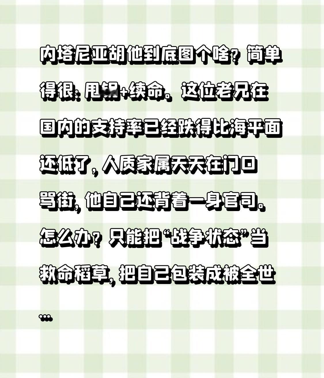 内塔尼亚胡他到底图个啥? 简单得很:甩锅+续命。 这位老兄在国内的支持率已经跌得比海平面还低了,人质家属天天在门口骂街,他自己还背着一身官司。怎么办?只能把“战争状态”当救命稻草,把自己包装成被全世界围攻的“孤胆英雄”。只要仗一直在打,他就能把国内所有烂摊子包括经济凋敝、社会撕裂、司法危机等,全都打包成一个“国家安全问题”。逻辑很简单:“都什么时候了,你们还搞内斗?先一致对外!”
