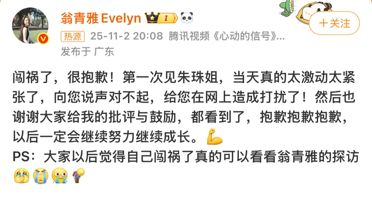 翁青雅道歉了。 原来都是因为太激动、太紧张。 这个道歉有点牵强啊。 修养不都是刻在骨子里的吗? 细节见人品。 且不说采访过程及内容专不专业,礼貌是必须的吧?一副大小姐姿态走在前面好像就是习惯啊! 如果这么基本的尊重都做不到的话,那就继续做大小姐吧。