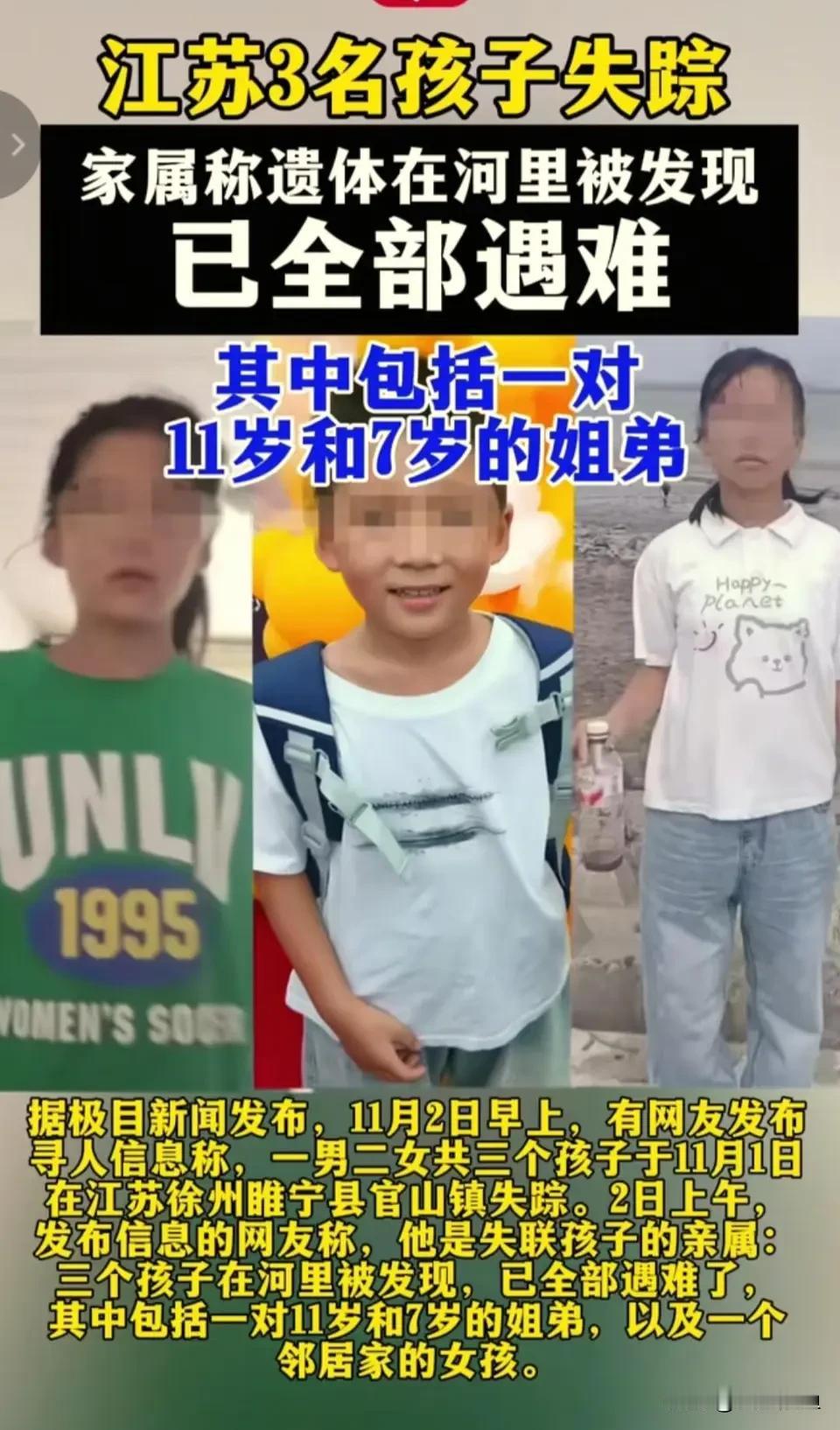 太痛心了!徐州睢宁赵王村三个孩子(最小才6岁)被发现在村边潼河里遇难! 这事儿发生在11月1号午饭后。村里一对小姐弟(姐姐10岁,弟弟6岁)和邻居家11岁的女孩,仨孩子结伴出门玩,跑到了村南头那个又深又陡的潼河边。监控看得人难受死了!下午两点多,他们就在水里挣扎、喊救命了!可恨的是,岸边那会儿一个人都没有!家里人发现孩子不见急疯了,找到第二天,才...才捞上来... 现在查河道谁管、牌子立没立当然重要,但最扎心的是:6岁的小不点儿离开家,大人咋就没发现、没去找呢?家门口就是河,心也太大了!就算最后查出别人有责任,赔再多钱,孩子能回来吗?天都塌了才后悔,晚啦!千万要盯紧自己的孩子啊!