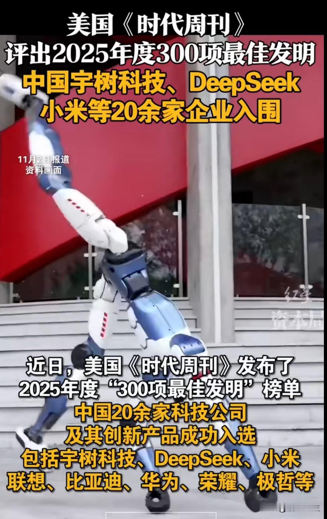 美国《时代周刊》2025年度300项最佳发明揭晓,中国宇树科技、DeepSeek、小米等20余家企业入围,涵盖人工智能、机器人、新能源等多个领域。其中,宇树科技的"Walker X"人形机器人因实现1.5米高空翻动作入选,DeepSeek的多模态大模型因在医疗诊断领域准确率超过人类医生而备受关注。 这标志着中国创新正在从"量"到"质"的跨越!2015年,仅有3家中国企业入围《时代周刊》最佳发明;2020年增至9家;2025年突破20家,入围数量仅次于美国。尤其值得关注的是,入围企业中60%是成立不足10年的初创公司,显示出中国创新生态的蓬勃活力。 但与美国企业相比,中国企业在基础研究领域仍有差距:本次入围的300项发明中,美国企业在芯片、生物医药等核心技术领域占比达42%,而中国企业则集中在应用创新领域。如何加强基础研究,将是中国创新下一步需要突破的关键。