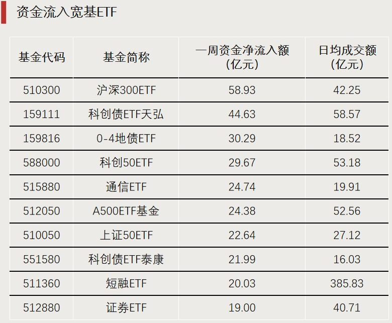 资金净流入方面,上周,多只宽基ETF“吸金”。在资金净流入额前十的ETF中,有4只宽基ETF。与中证A500指数挂钩的ETF资金合计净流入超45亿元,其中A500ETF易方达(159361)资金净流入超10亿元;科创板50ETF(588080)等跟踪科创板50指数的ETF资金合计净流入超30亿元。