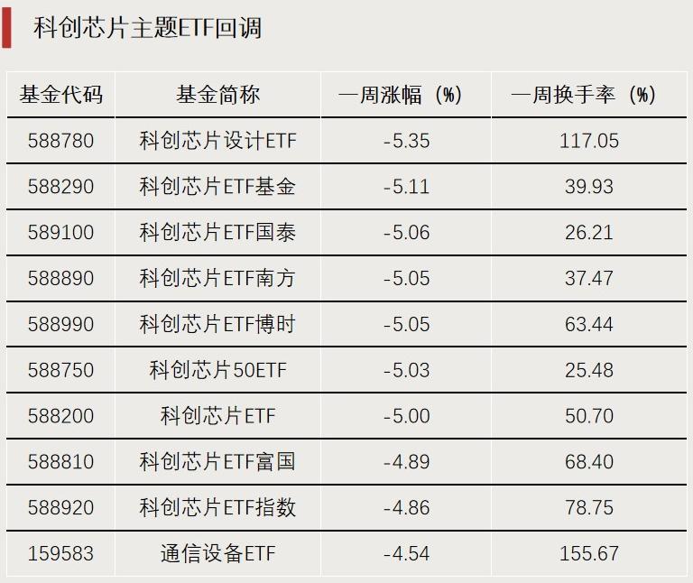 科技板块上周回调。上周,科创芯片主题ETF领跌,多只产品跌超5%;通信设备ETF、半导体ETF南方、集成电路ETF、人工智能ETF等AI相关ETF周跌幅均超4%。