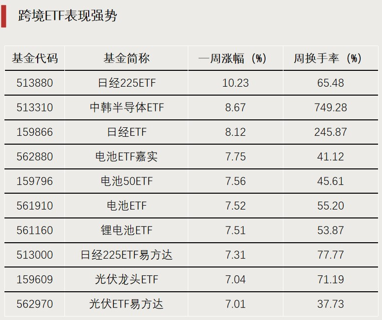 上周(10月27日至31日),日经225ETF、中韩半导体ETF和日经ETF等跨境ETF领涨;投资A股的ETF中,电池主题ETF和光伏主题ETF涨幅居前。科创芯片主题ETF回调,多只产品跌超5%。