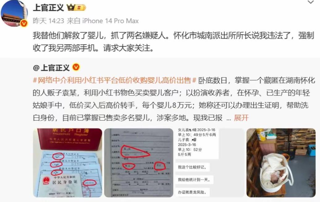 真是离大谱了!上官正义称举报贩婴案反被当址警方拘禁3小时,手机遭强制收缴,当小米奇的爸爸说他的兄弟去解救拐卖婴儿单独行动之后就给他打电话求救,后面就失联,我就知道肯定是有大事发生,我就猜到这个人一定是上官正义,但没想到今天事情爆出来这个事情这么惊奇! 11月1日中午,打拐志愿者上官正义顶着风险拨通了湖南怀化市公安局鹤城分局的举报电话,焦急地告知警方自己摸清的贩婴窝点位置,这个窝点里,嫌疑人袁某正通过小红书物色买家,把从年轻姑娘手中低价买来的婴儿以8万元高价转手,甚至还能伪造出生证明帮孩子“洗白”身份。 挂了电话,上官正义没闲着,全程跟着警方去现场,不仅协助解救了一名婴儿,还亲手帮着抓了两名嫌疑人,本以为这是件立大功的好事,等着他的却是意想不到的对待。 城南派出所的所长突然站出来,张口就说他“涉嫌钓鱼执法”,属于违法行为,没等上官正义辩解,就强行抢走了他随身携带的两部手机,要知道,这手机里存着大量贩婴团伙的交易记录、聊天截图,全是关键证据啊! 接下来的3个多小时,成了上官正义的“噩梦”,他被安排了好几名民警专人看管,别说离开派出所了,就连上厕所都被严词拒绝,完全失去了人身自由。 期间,怀化市公安局的一名科长赶到现场,看不过去,明确要求派出所归还上官正义的手机,可鹤城分局一个姓田的领导态度极其恶劣,不仅当场拒绝,还口出狂言,说出“你怎么不去帮美国打仗”这种莫名其妙的话。 另一边,小米奇的爸爸早就心里打鼓,之前他就说过,有个兄弟单独去解救被拐婴儿,中途打电话求救后就彻底失联,当时他就预感大事不妙,凭着对打拐圈的了解,他隐约猜到这个失联的人就是上官正义,只是没想到事情爆出来会这么离谱。 直到11月1日傍晚将近6点,上官正义才被允许离开,手机也是这时才拿回来,而这3个多小时里,警方压根没问过他案情,最后还是他主动把举报材料交出去的,倒是离开前有位副局长过来简单了解了下情况。 11月2日,鹤城分局发了警情通报,承认了上官正义举报属实,说已经成功解救3名婴儿、抓获4名嫌疑人,可对于拘禁他、抢手机这些事,半个字都没提,更别说解释了。 上官正义当天发视频感谢大家的关注,语气里满是疑惑和寒心,他反复强调自己是举报者,不是犯罪嫌疑人,至今为止,怀化市没有任何一个单位主动联系过他,他只能公开恳请湖南方面依法追责。 其实,了解上官正义的人都知道,他干打拐这行多年,从来都是小心翼翼,不越界不蛮干,去年一年就举报了43家涉事医院,每次都是蹲点核实、固定证据后才报警,就是怕出纰漏。 他一个人自费打拐,靠自媒体直播带货的收入支撑开支,不怕犯罪分子的威胁,甚至被威胁过注射病毒都没退缩,如今却栽在本应并肩作战的执法者手里,这换谁能接受? 警方口口声声说对侵犯妇女儿童犯罪零容忍,可转头就对提供关键线索的举报人如此对待,这不是寒了所有志愿者的心吗?以后谁还敢冒着风险去举报涉拐线索? 更让人不解的是,通报里说“通知举报人配合调查”,可配合调查和非法拘禁能是一回事吗?抢手机、不准上厕所,这哪是对待举报人的态度,倒像是对待犯罪嫌疑人。 按照公安部的规定,民警执法要自觉接受群众监督,不能强行干涉拍摄,可怀化警方不仅抢手机,还呵斥上官正义不准拍摄,这难道不是违规操作? 志愿者是打拐路上的重要力量,他们就像黑暗里的萤火,凭着一腔热血照亮真相,可如果连萤火都要被随意打压,那拐卖犯罪的土壤只会更顽固。 执法的初衷是维护正义,不是滥用权力,对待举报人,哪怕做不到礼遇,至少要尊重人家的合法权利吧?不能让英雄流血又流泪。 这件事绝不是简单的“误会”,怀化警方必须给出详细的解释,到底为什么拘禁举报人?为什么说他违法?田姓领导的恶劣态度又该怎么处理? 正义从来不是单方面的付出,而是需要整个社会的守护,尤其是执法者,更应该成为正义的后盾,而不是绊脚石。 大家觉得怀化警方该如何回应这件事?上官正义的遭遇又该如何追责?