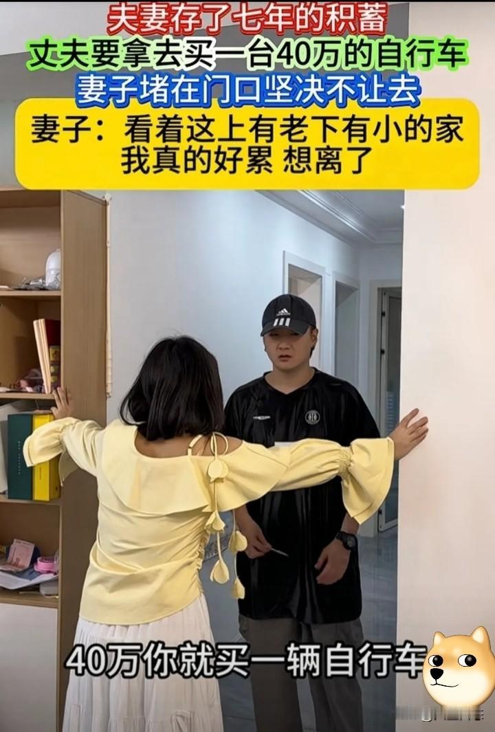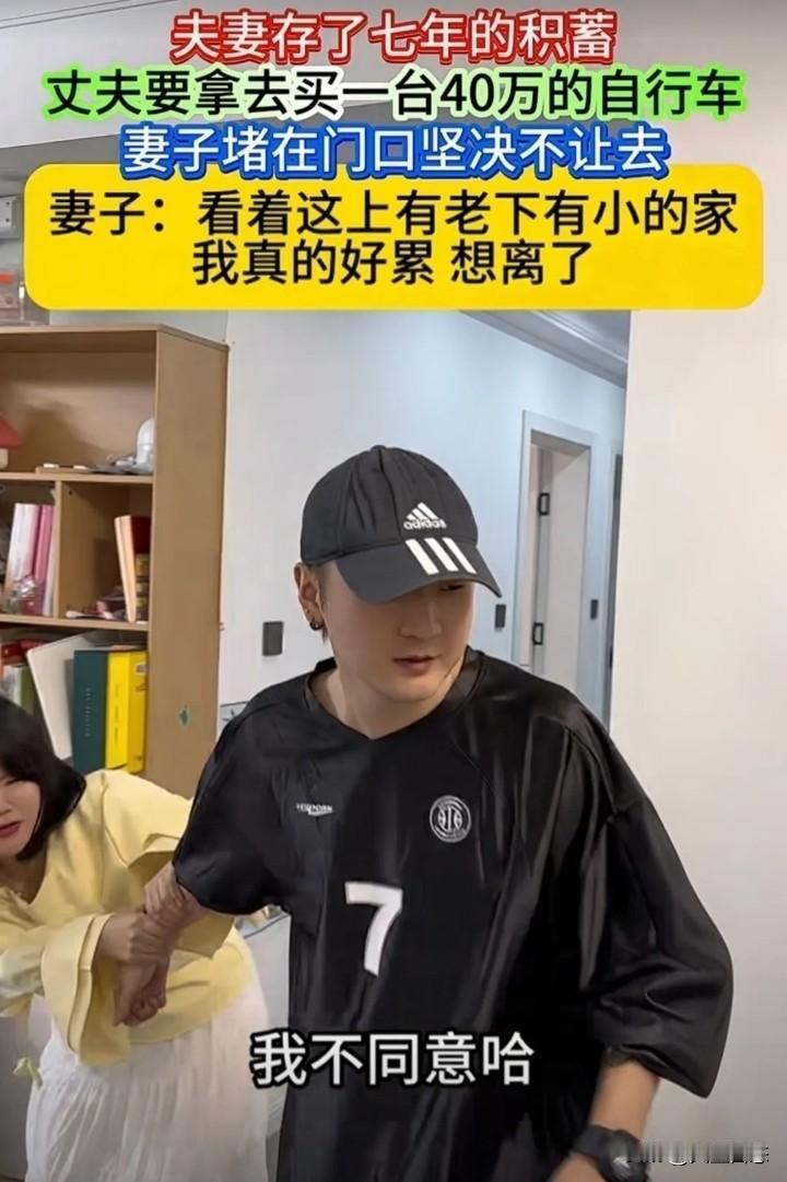 七年血汗攒40万,丈夫转身要买一辆自行车!妻子堵门痛哭:“这个家我过不下去了!” 女人攒钱想的是孩子的补习班,老人的医药费,家里的房贷。男人攒钱想的是自己的玩具。婚姻的悲凉,莫过于此。 妻子想离婚不是一时气话,是长期失望的积累。这次是自行车,下次会是什么?及时止损,是成年人最明智的选择。 这不是爱好问题,是智商问题。七年积蓄买辆不能遮风挡雨的自行车?兄弟,你活的不是日子,是童话。