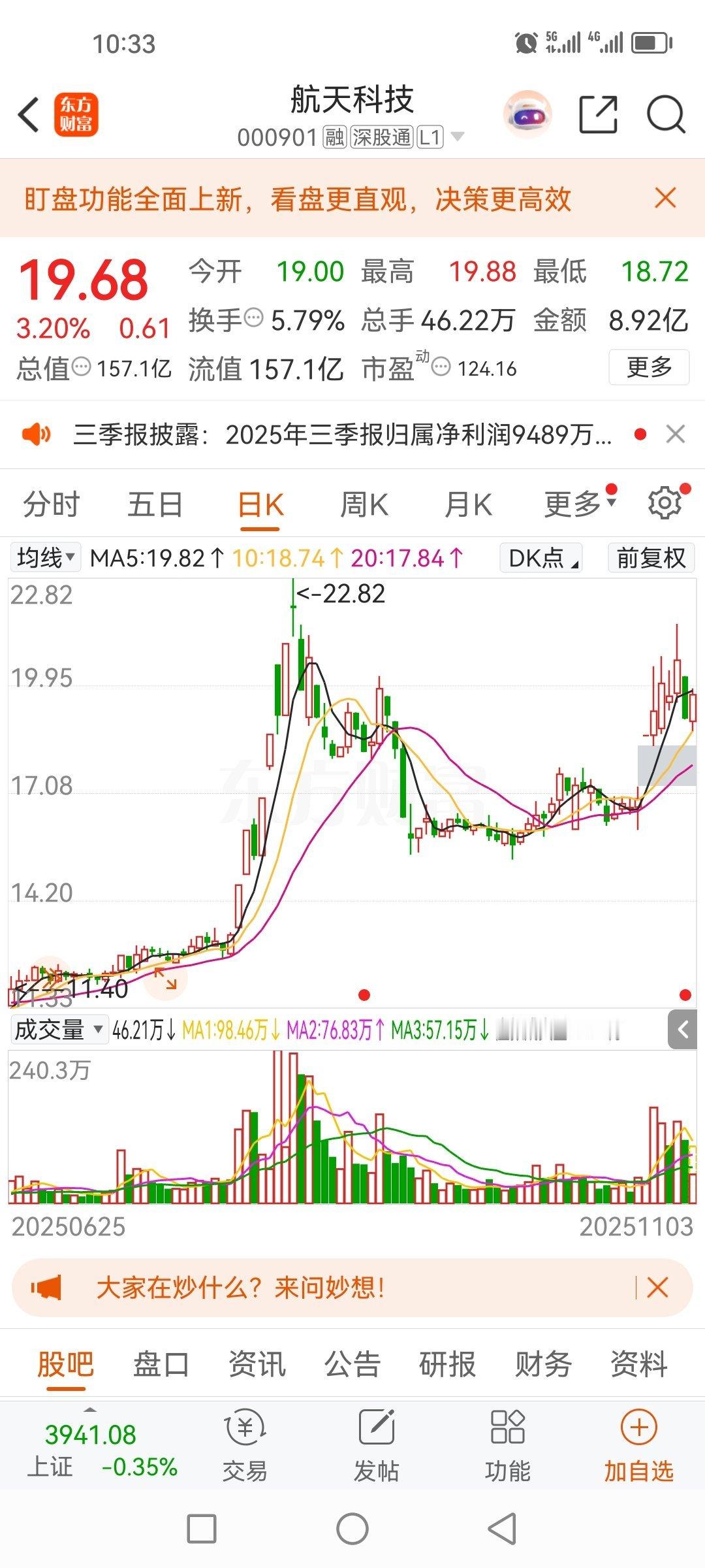 27号的航天科技000901,前面操作了的都盈利了,拿到今天的话只能说韭菜炒肉,各一半吧!