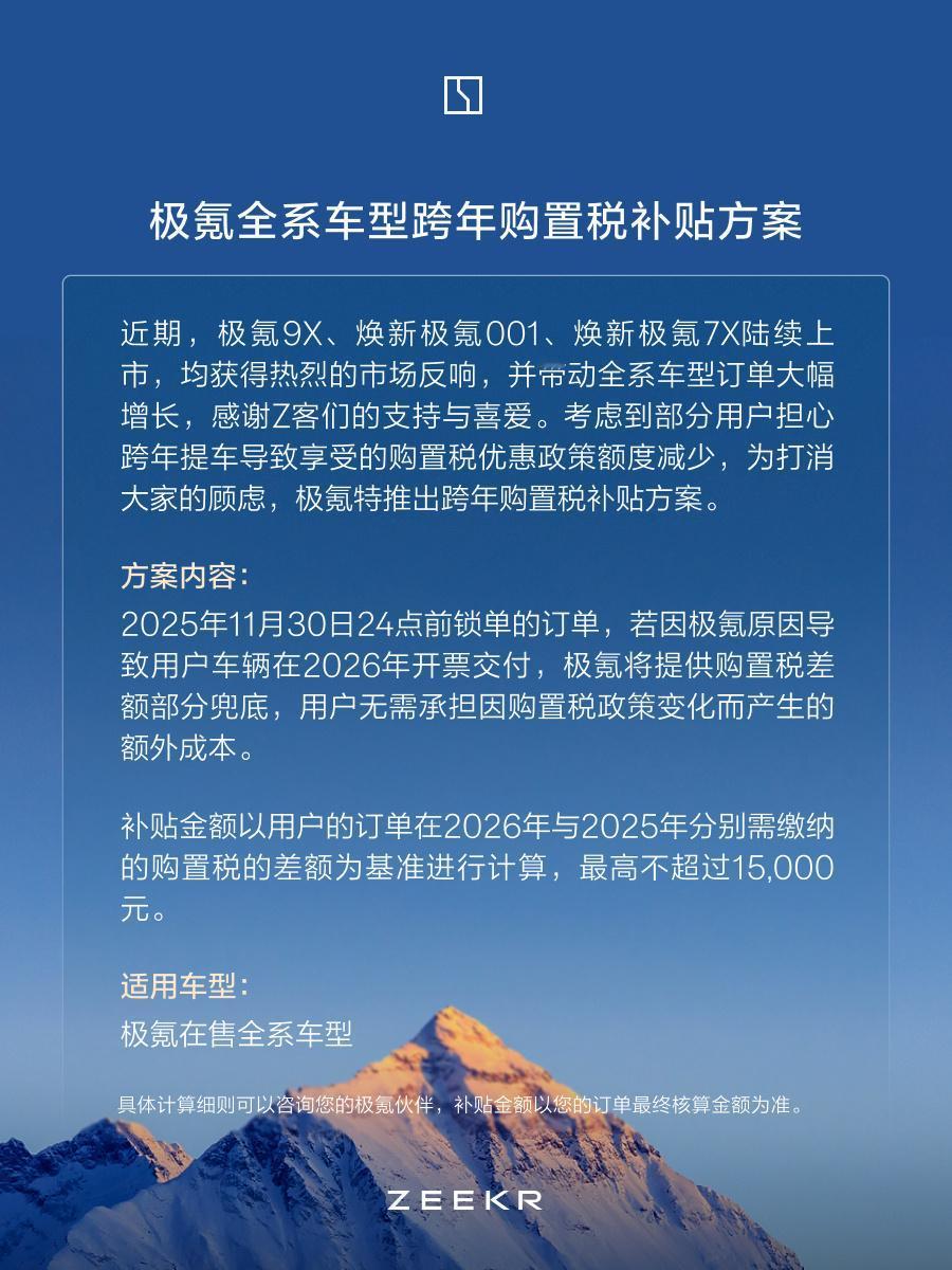 极氪也跟了跨年购置税补贴方案。 年底前锁单的不用担心2026年交车时多交购置税了,极氪兜底,放心。