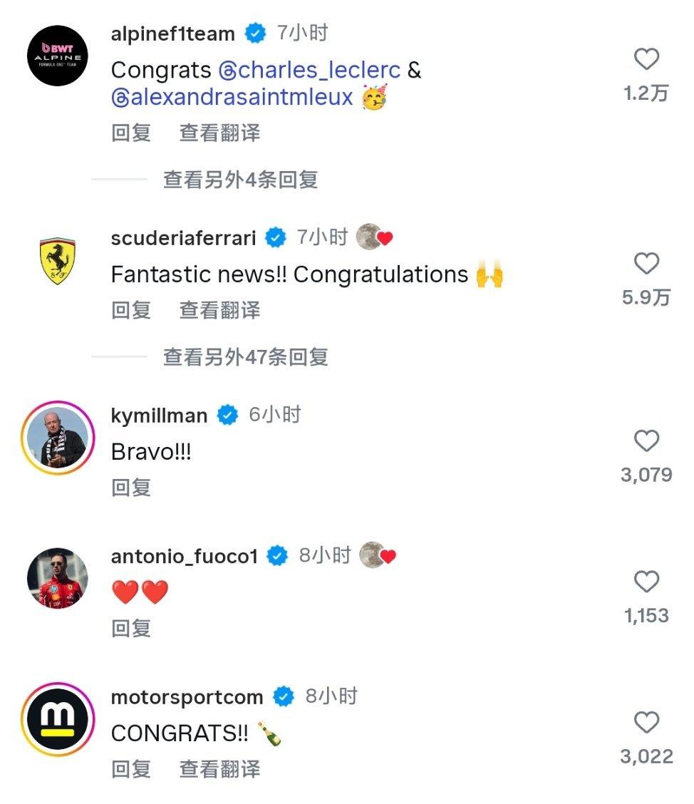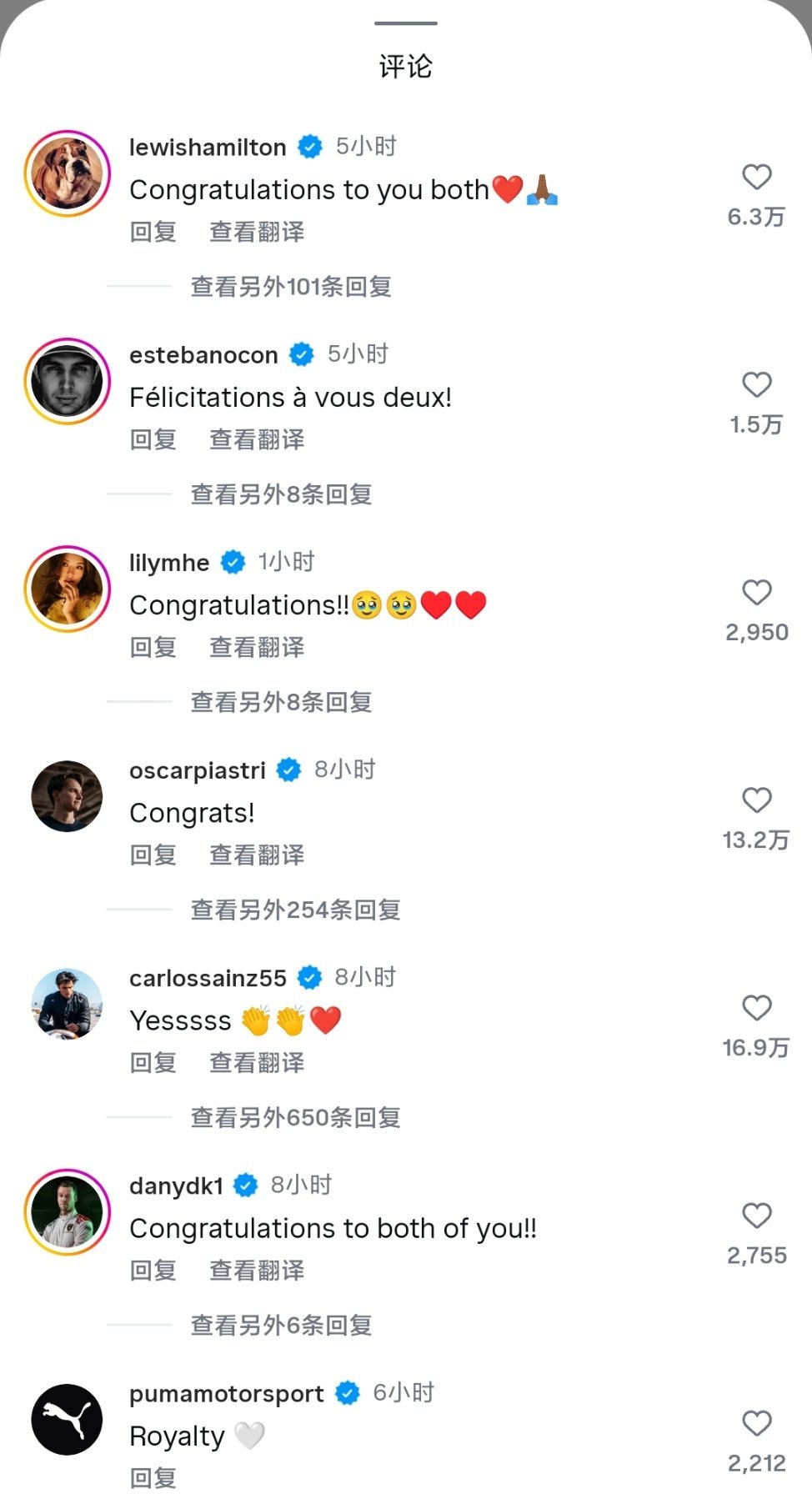 汉密尔顿、奥康、Lily何沐妮、皮亚斯特里、小赛恩斯、科维亚特、PUMA、Alpine车队、法拉利车队、F1官方…等:发来祝贺 恭喜两位![心]