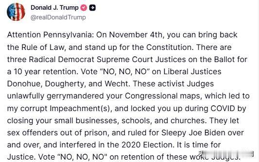【黄金时代】川普呼吁宾夕法尼亚选民对三名觉醒大法官留任投“反对反对反对”票 宾夕法尼亚州的选民们请注意:11月4日,您可以捍卫法治,捍卫宪法。三位激进民主党籍最高法院大法官将面临十年任期的选举。请对自由派大法官多诺霍、多尔蒂和韦希特投“反对、反对、反对”票。这些激进的法官非法操纵选区划分,导致我遭到腐败的弹劾,并在新冠疫情期间关闭了你们的小企业、学校和教堂,使你们陷入困境。他们释放了性犯罪者,一再支持瞌睡乔·拜登,并干预了2020年大选。现在是伸张正义的时候了。请对这些觉醒派大法官的留任投“反对、反对、反对”票。