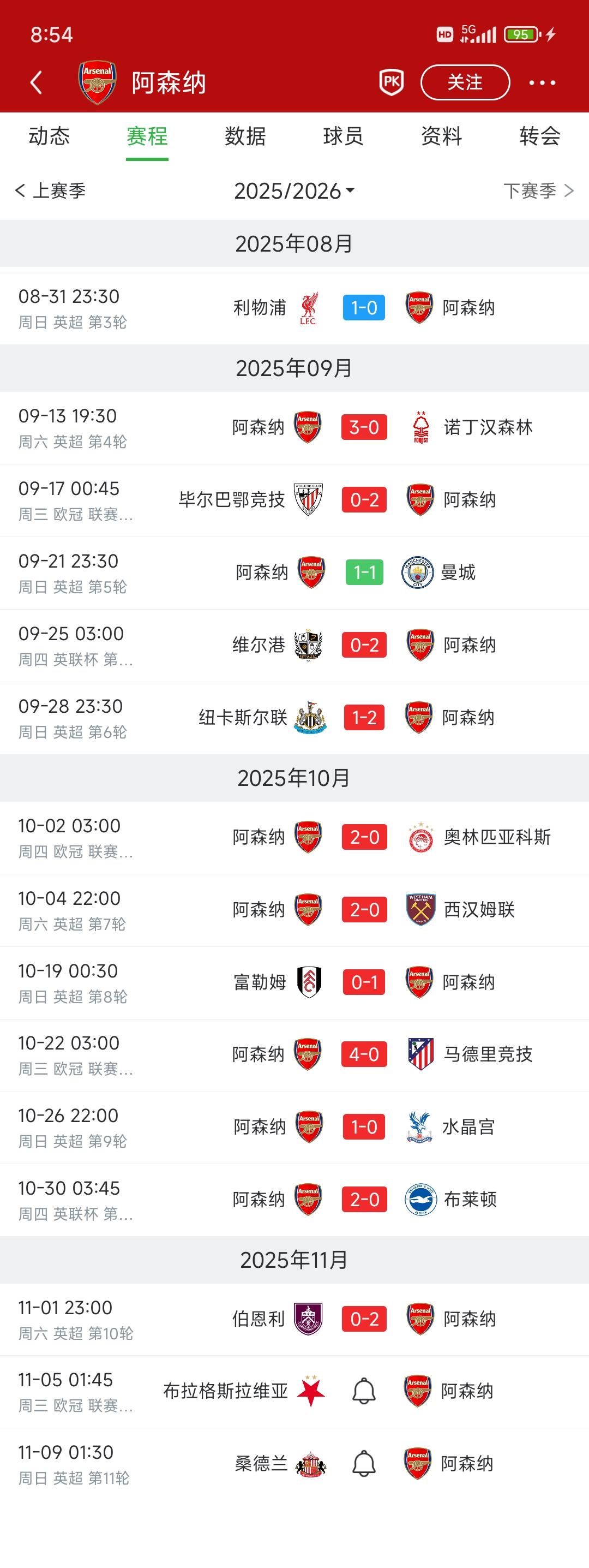阿森纳现在给人一种感觉,一觉醒来就是一场胜利! 看看最近阿森纳的成绩,全部都赢,飘红! 只有遥远的8月31号,输给索博斯洛伊1记超级任意球,还和曼城平过一场。 9月份不败,10月份全胜。 现在11月第一场又赢,几乎没有任何悬念。 阿森纳不会100分夺得英超冠军吧?? 我记得利物浦30年一冠,其实有机会超越曼城100分的,可惜后面不行。 100+积分阿森纳或许才是那个王者![赞]