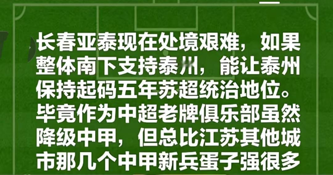 有人异想天开,希望长春亚泰支持泰州,保证称霸苏超联赛! 这真是一件不可能的事情,中超球队很贵的,光是一名外援的工资,转会费苏超都付不起。 现在苏超只需要给球员训练费,很便宜。 中超太多球队就是没钱,才消失的。 咱们江苏队就是例子,泰州还能养长春亚泰?我认为不可能,养不起。 还有其他问题更多,更麻烦。[笑哭]