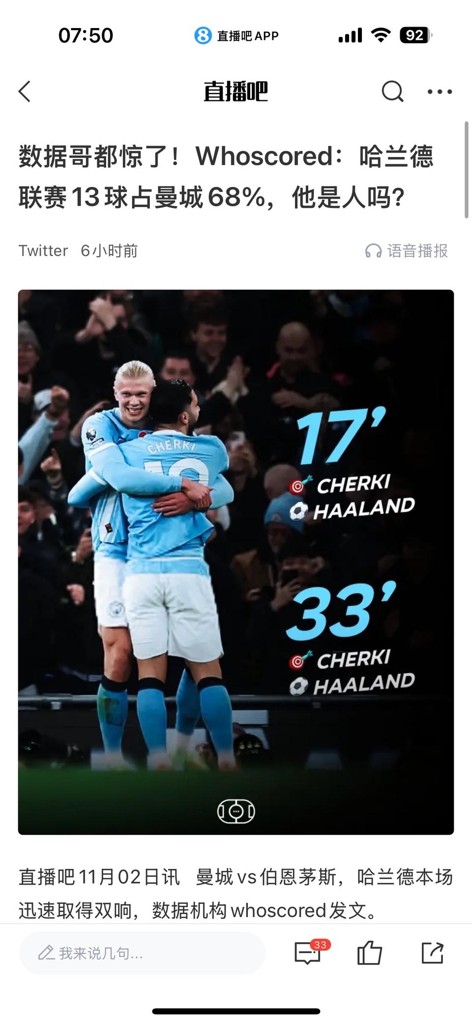 讨论哈兰德的重要性,一个人进球占曼城68%,有他曼城才在争冠行列。 没有哈兰德,估计曼城都在保级区。 这个赛季哈兰德实在太厉害了,也是隐患,其他人都不行。 比如马尔穆什才打进1球,其他曼城球员最多2球。 或许曼城成也哈兰德,败也哈兰德!![大金牙]