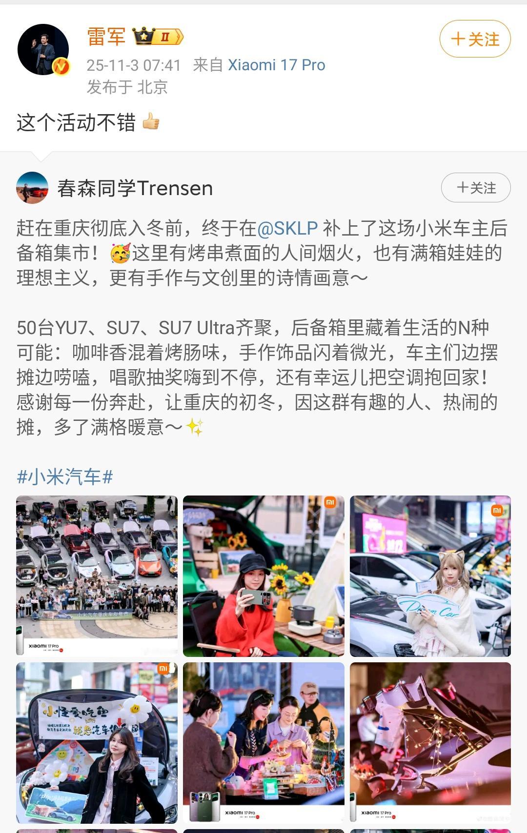 雷军点赞小米汽车的集市活动!雷军:活动不错[赞] 从活动的安排来看,这是一个官方组织的活动,毕竟连春森的手机的水印都带有小米17 Pro的标记。 这既是宣传小米的汽车又是宣传小米的手机,同时也是一个大型的车友会活动。 春森此前购买的小米SU7曾经跑过了欧洲,这为他收获了大量的流量,实际上他也是一个自媒体博主,就是通过播放量与厂家合作的方式,成功实现自己的商业价值。 各位是怎么看的?欢迎评论区留言。