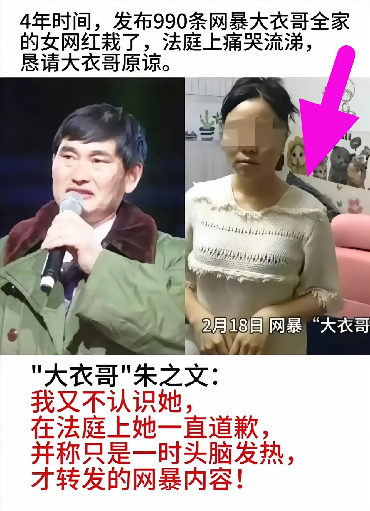 将近六年网暴终于是完事了, 大衣哥一案也是给所有人都敲响警钟! 法律可终于还了“大衣哥”朱之文一个公道!江苏徐州五十多岁的孙某某,因多年来持续发布近千条恶意视频对大衣哥朱之文进行侮辱诽谤,最终被法院是判处有期徒刑六个月。 此案最让人愤怒的是,网暴者孙某某的行为那可是毫无底线,不仅是针对大衣哥朱之文本人,而且连他不到一岁的孙子也成为攻击对象。这种为博关注不择手段的行为,真的是践踏了法律与道德的两重底线。 朱之文这次选择刑事自诉并且坚决拒绝调解,展现了用法律武器直面网暴的决心。他的胜利,不仅仅是个人对尊严的捍卫,更是为所有网络暴力受害者树立了维权的典范。 网络绝对不是法外之地,每一个网络暴力背后的人都必须要为自己的言行负责。 这起判决,您支持吗?欢迎在评论区分享您的看法!