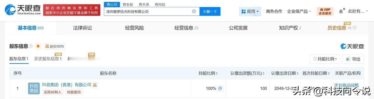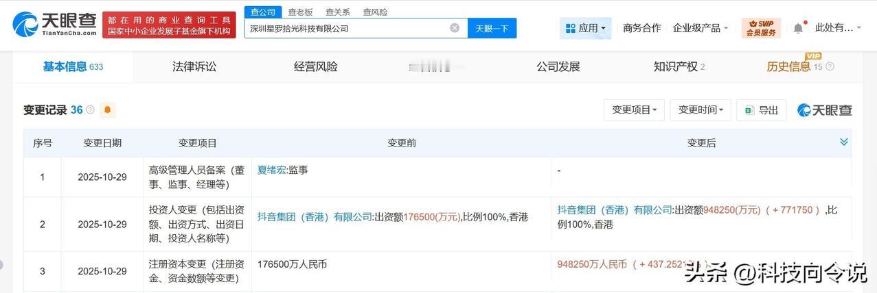 【抖音旗下深圳星罗拾光科技公司增资至94.8亿 增幅约437%】 天眼查工商信息显示,近日,深圳星罗拾光科技有限公司发生工商变更,注册资本由17.65亿人民币增至约94.8亿人民币,增幅约437%。 该公司成立于2022年9月,法定代表人为石玉磊,经营范围含信息系统集成服务、软件开发、货物进出口、技术进出口、计算机软硬件及辅助设备批发、计算机软硬件及辅助设备零售等。股东信息显示,该公司由抖音集团(香港)有限公司全资持股。 天眼查信息:
