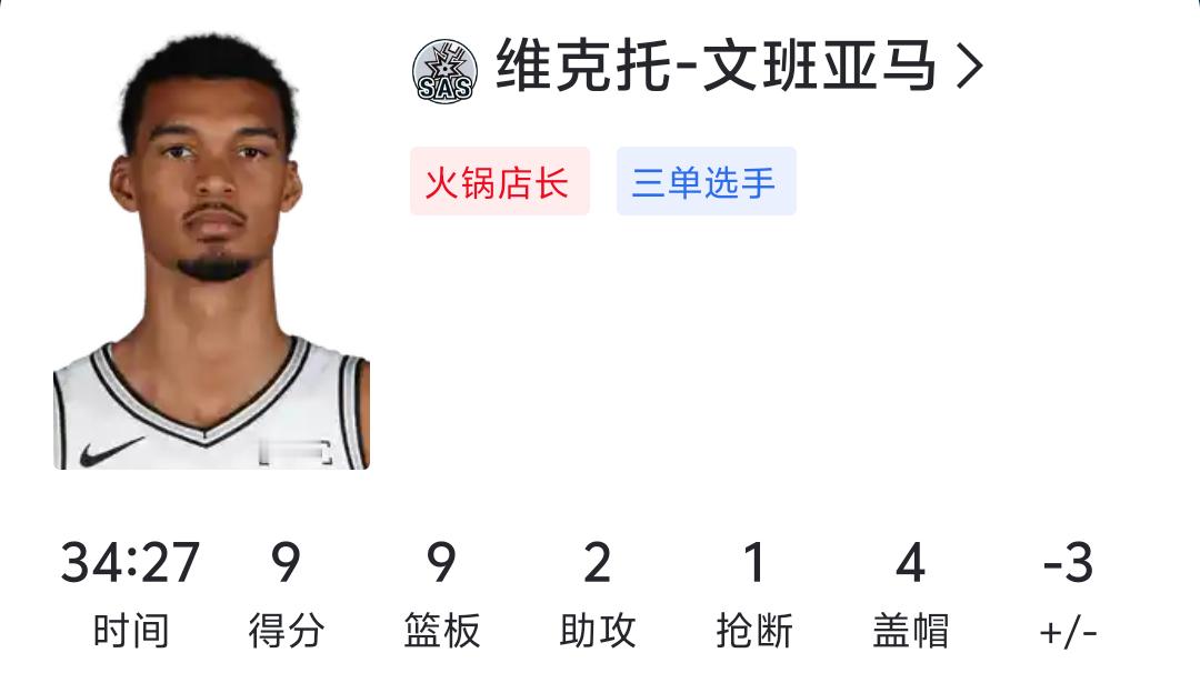 文班亚马今日表现不佳仅得9分9板2助4帽同时伴有6次失误