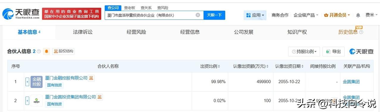 【厦门市盘活存量投资合伙企业登记成立出资额50亿】 天眼查工商信息显示,近日,
