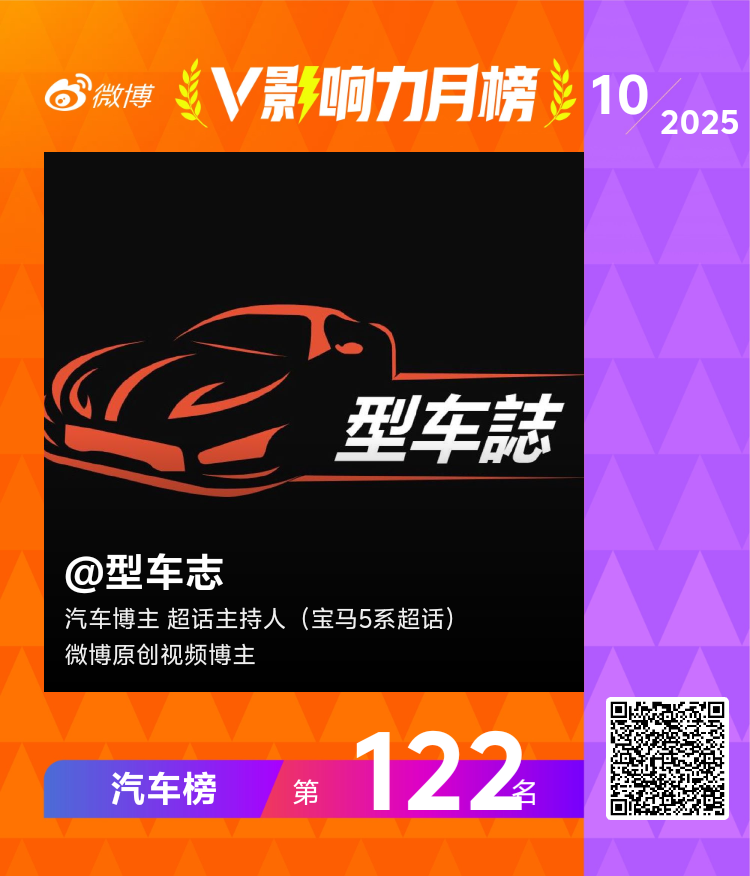 V影响力榜 十月微博汽车榜第122名。说实话,看到排名的时候其实挺意外的。这个账号从一开始就没什么运营目标,只是想认真地拍车,聊车,记录汽车生活中那些心动的瞬间。