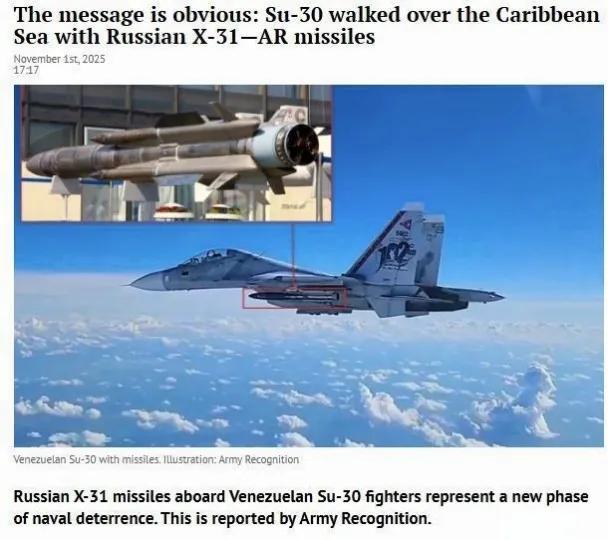 委内瑞拉空军苏-30MK2V战斗机挂载Kh-31A超声速反舰导弹在加勒比海巡逻,对美国海军发出警告。 近段时间,美国在委内瑞拉周边部署重兵,而且美国总统老特公开说要对委内瑞拉动武,搞得加勒比海地区局势急剧紧张。 面对美国的军事威胁,委内瑞拉自然不能怂,否则可就真的是灭顶之灾了。#委内瑞拉空军#