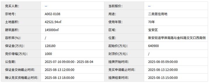 A002-0108宗地位于宝安新安街道,为纯商品房用地,土地面积42521.94㎡,建筑面积145000㎡,容积率≤3.4,土地用途为二类居住用地。