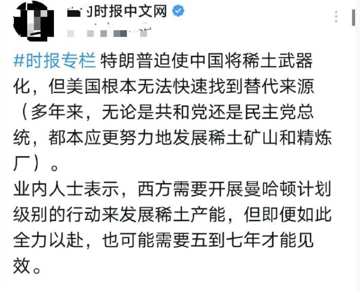 《纽约时报》这回居然说了句实话!即便美西方全力以赴,像当年搞曼哈顿工程那样突破中国稀土“卡脖子”技术,乐观估计也得5-7年时间。 11月3日,《纽约时报》的一篇报道在西方世界炸了锅。 文章直言:就算美国和西方盟友不计成本、像二战时期搞“曼哈顿工程”一样冲刺稀土领域的关键技术,也至少得花五到七年时间才有可能突破中国的技术封锁。 这等于承认了一个现实,2025年的今天,西方仍被中国稀土死死“卡着脖子”。 这种罕见的坦白背后,不是西方突然变得诚实了,而是他们终于开始意识到: 这场关于稀土的战略博弈,不是靠热血和口号就能赢的。他们手里没有牌,中国却正好拿着一副王炸。 中国的稀土管控策略,从来不是简单粗暴的一刀切,而是讲究节奏、讲究分寸、讲究对象。 你动我一分,我紧你三成;你缓一缓,我松一手。“松松紧紧、有紧有松”的调控方式,才是真正让美国头疼的地方。 他们不知道中国下一步会怎么走,也搞不清楚哪些企业还能继续拿到货,哪些企业要被卡住喉咙。这种不确定性,才是最致命的。 别忘了,现在是2025年,不是2015年。中国早就不是那个只靠资源出口吃饭的国家。 稀土的产业链,中国早就从上游挖矿、冶炼分离,到中游材料制备,再到下游终端应用,做到了全链条自给。 而西方呢?连自己的矿都不敢采,怕污染、怕成本、怕民意,一边喊着“去中国化”,一边还要来中国买原料。这不是卡脖子,是卡脑子。 更要命的是,美国那些盟友根本靠不住。欧洲国家嘴上说得好听,行动上一个比一个谨慎。 德国企业怕失去中国市场,日本企业根本不愿沦为美国战略的“工具人”,就连澳大利亚这个“铁杆”,也在2025年下半年突然搁置了对稀土出口项目的补贴计划。 原因很简单,中国一旦限制出口,他们这些国家的制造业第一个遭殃。没有哪家资本愿意拿自己的利润去陪美国的政治表演。 所以说,别看“美西方”天天开峰会、搞联合声明,真要动手搞自己的稀土产业链,各家算盘都打得精着呢。 美国想主导、欧洲想分利、日韩想低调、澳洲想赚钱。你说这种联盟像铁板一块?怕不是豆腐做的。 就算真像《纽约时报》说的那样,搞个什么“稀土版曼哈顿工程”,你得先看看谁愿意出钱、谁愿意冒险、谁愿意被美国牵着鼻子走。 而中国这边呢?不仅有产业链,还有策略。对美国,我们自然要“紧一紧”;对它的盟友,我们可以“松一松”;对那些愿意合作的企业,我们“区别对待”。 2025年,中国的稀土出口政策已经精细到了企业级别。一家美国企业如果长期在华投资、维护合作,那它就有可能继续获得稀土供应。 反之,那些跟军方、情报系统绑在一起的企业,就算你跪下来求,也别想拿到一克钕铁硼。 这才是真正的高水平博弈,不用打,不用骂,只需动一动供应链,就能让对手自己慌了阵脚。 美国财政部长贝森特在2025年6月的声明,就是一张写着“求和”的明信片。 他说特朗普政府将尽快与中方举行关键矿产问题的高层会谈,说白了就是承认稀土问题已经成了美国的“国安问题”,工业链被掐了脖子,连喘气都费劲。 而特朗普呢?他倒是急,急到在4月份签署了一个允许海底采矿的行政令,试图通过“海底稀土”另辟蹊径。 可是现实告诉他,这东西不是想挖就能挖的,技术门槛高、成本惊人、周期又长,等你挖出来,中国都已经完成下一代稀土材料研发了。 你说他这是开辟新战线?不如说他是在给资本市场画饼。 更可笑的是,美国自己都没个统一战略。今天你说要搞替代,明天换个总统可能又换个方向。 谁敢投几百亿美元去搞个稀土产业链,结果两年后政策一变,投资打水漂? 2025年的华尔街早就看穿了这一点。他们要的是回报,不是给国家当义工。 这也是为什么,中国的策略才是最聪明的,不一棍子打死,而是掌握节奏、分化对手。 美国想拉拢盟友?我们就让盟友看到合作的好处。美国想搞替代供应链?我们就让企业看到断供的代价。