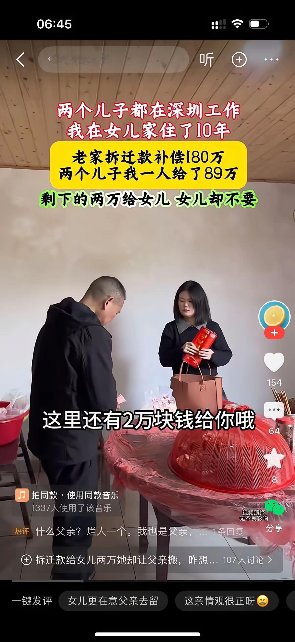 这样的父亲还有脸再见女儿,这女儿估计以后与家人来往少了。让我遇上拆迁,180万这样分,一个儿子50万,自己留30万,女儿20万,这30万住谁家,补偿日常开支,不能平分,儿媳妇不乐意了!