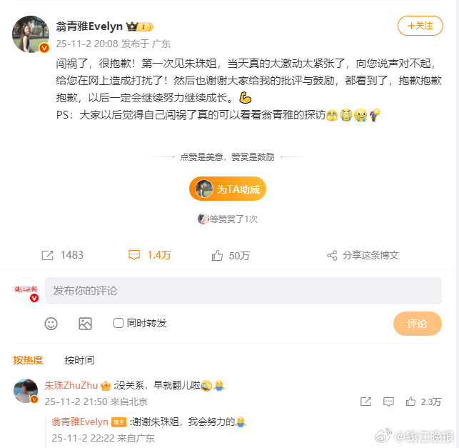 【翁青雅翻车遭质疑是否重流量轻专业】#朱珠说没关系早就翻了##饶雪漫回复翁青雅# 翁青雅采访朱珠翻车,翁青雅道歉等话题冲上热搜,一场跨界专访意外成了公众讨论的焦点,放在聚焦主持人的《令人心动的offer7》节目中,显然就是考核不过关。网友看法两极:有人觉得新人需容错空间,也有人犀利指出"紧张不是失礼的借口",更质疑行业是否重流量轻专业。