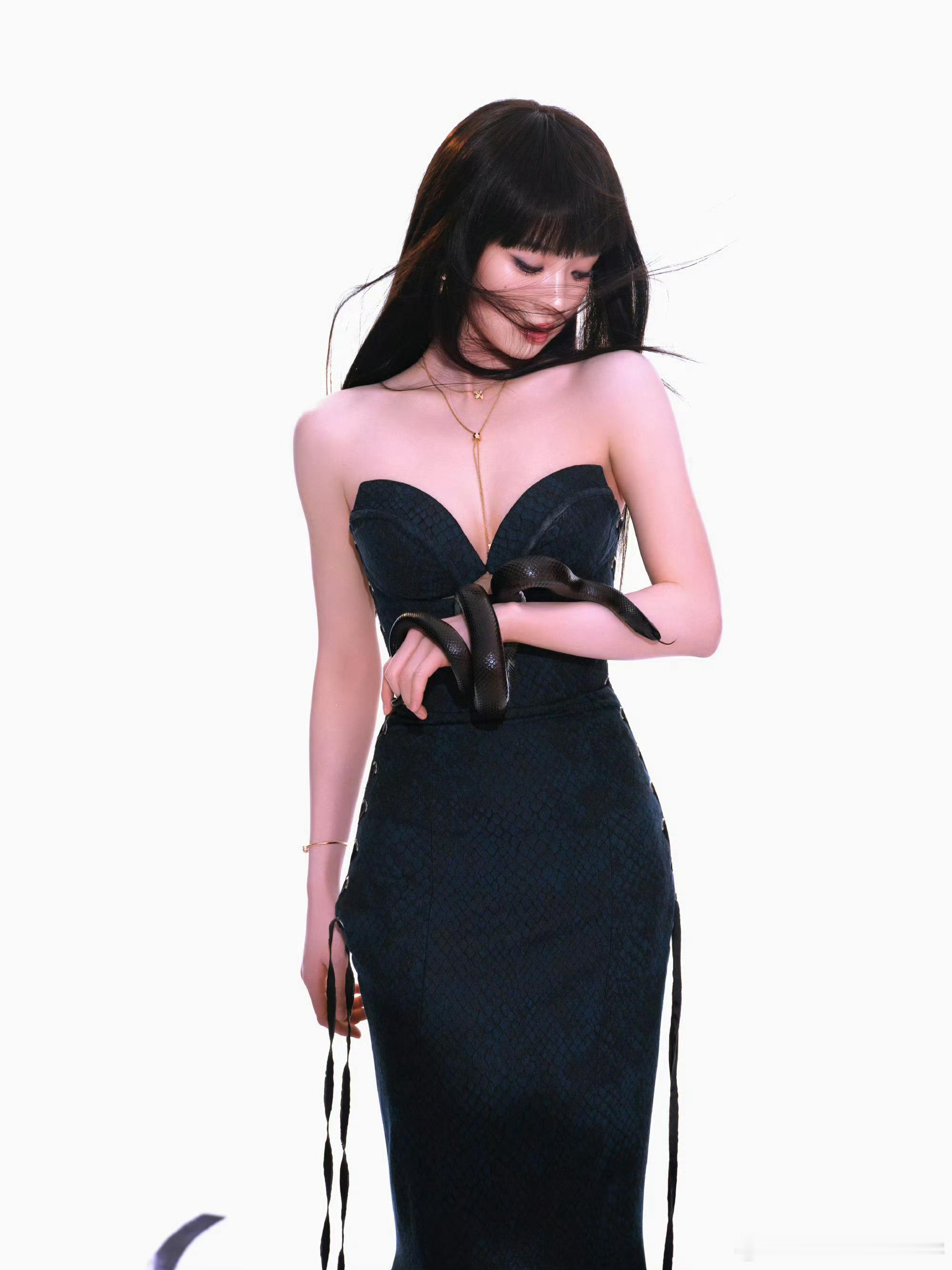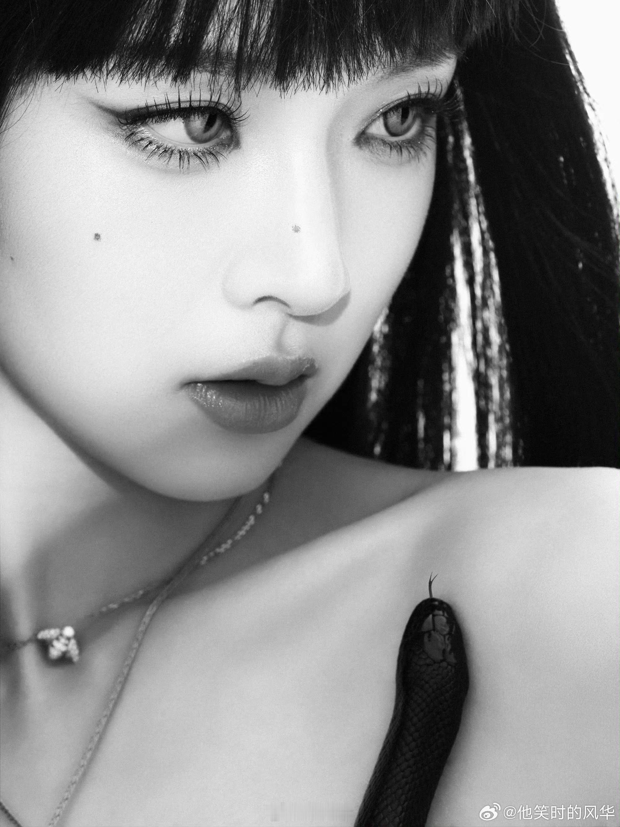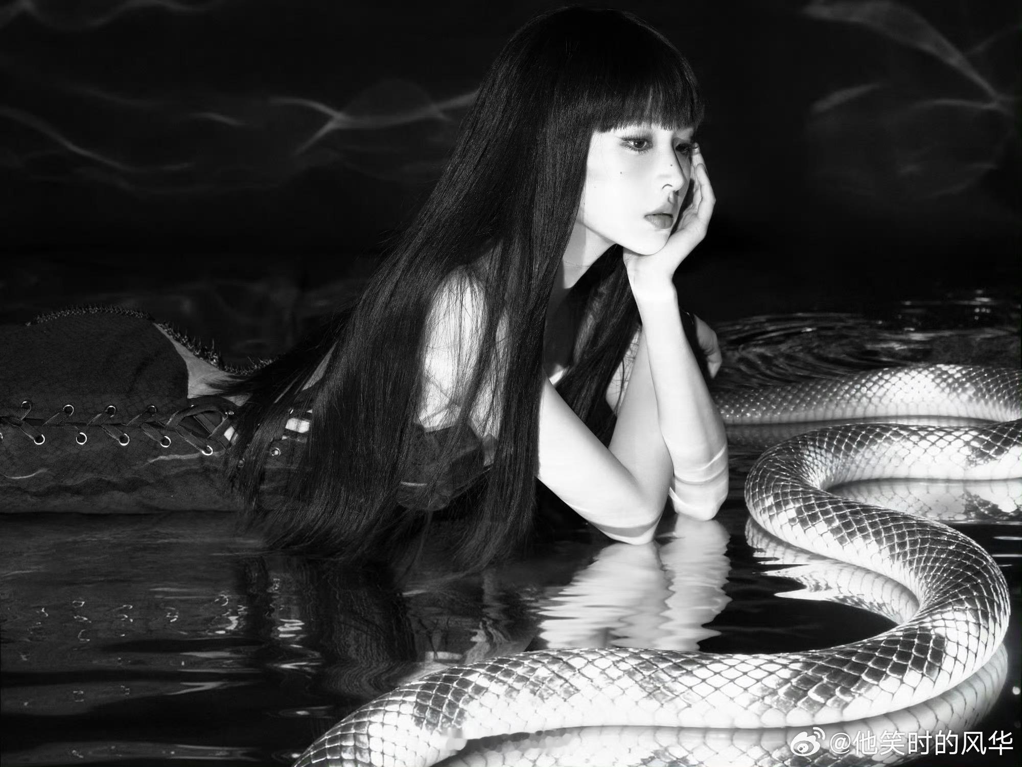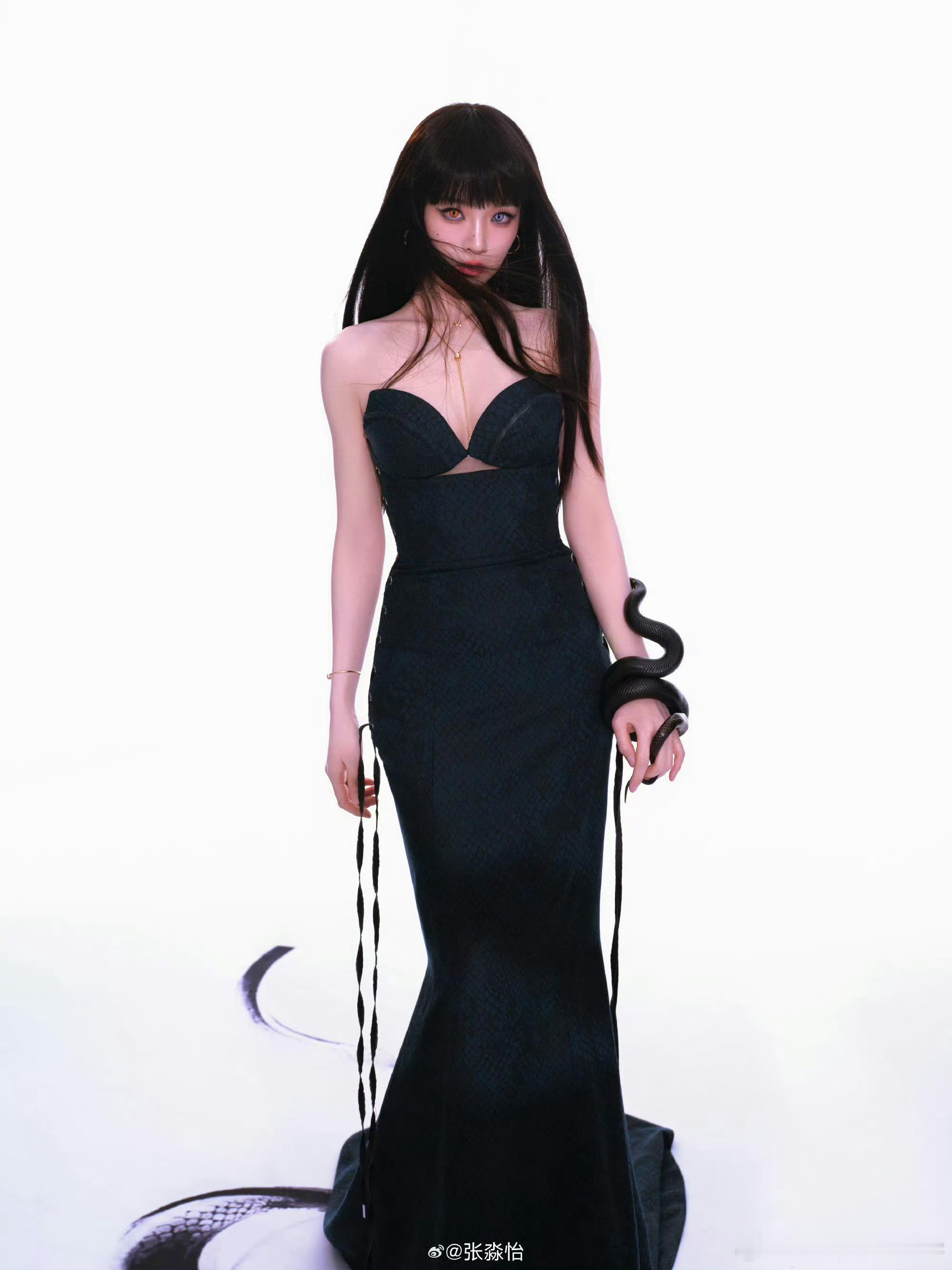 张淼怡异瞳蛇姬 左眼碧波荡漾、右眼红焰燃烧,张淼怡异瞳蛇姬造型太戳人!蛇影蜿蜒+黑色长裙,全身散发独特光泽,神秘冷艳感爆棚,不愧是造型无瓶颈的美人!