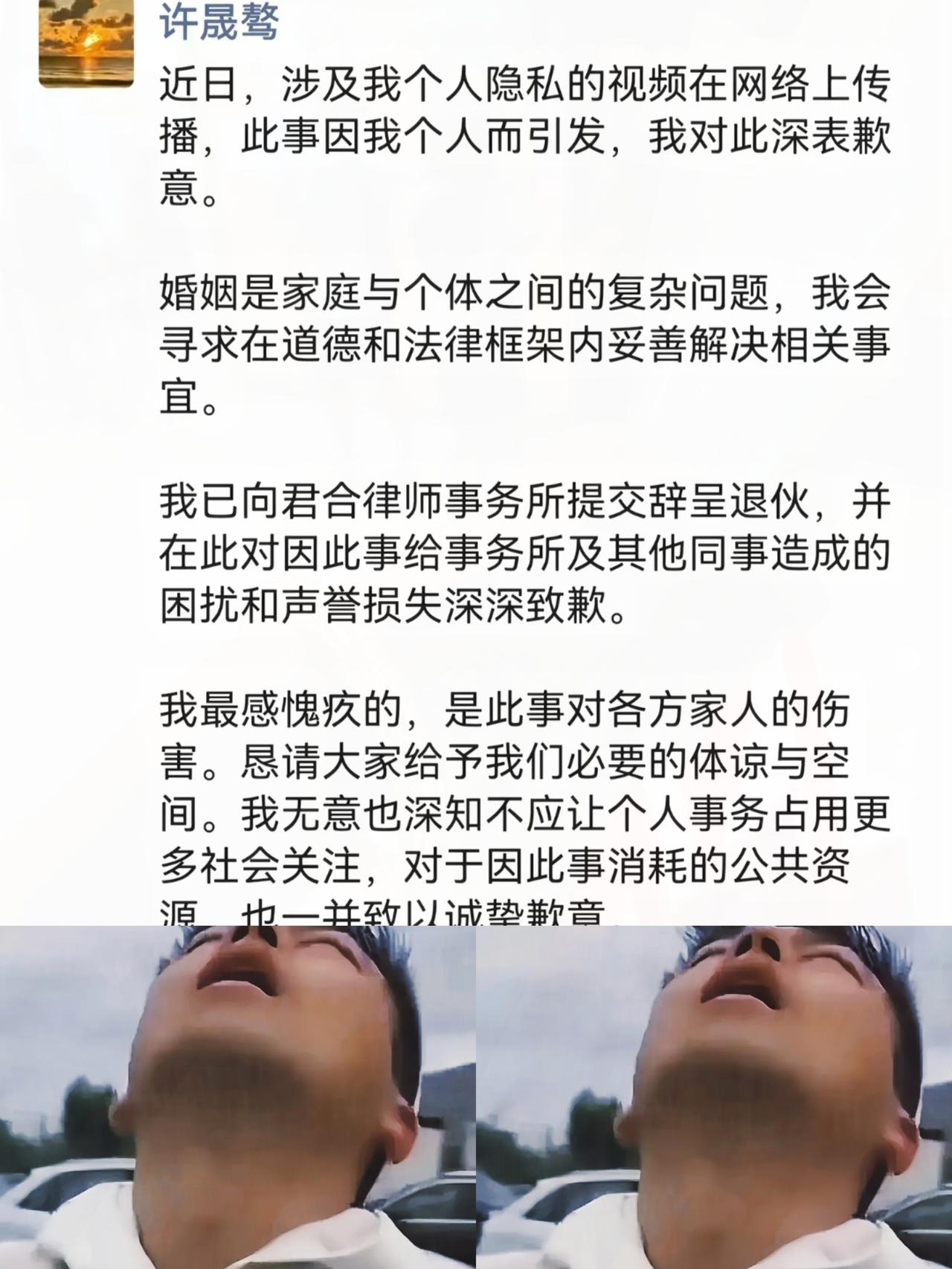 果然律师就是律师啊! 就在今天,那个出轨律师离职了 在他的通告里清楚的写着关于自己个人 私事给大家造成的困扰和占用公共资源 致歉,并且给各方家人造成影响的认知,唯独没有对原配造成伤害的道歉和悔悟,看看这个男人,根本没有认知到自己的错误,对原配只字未提。