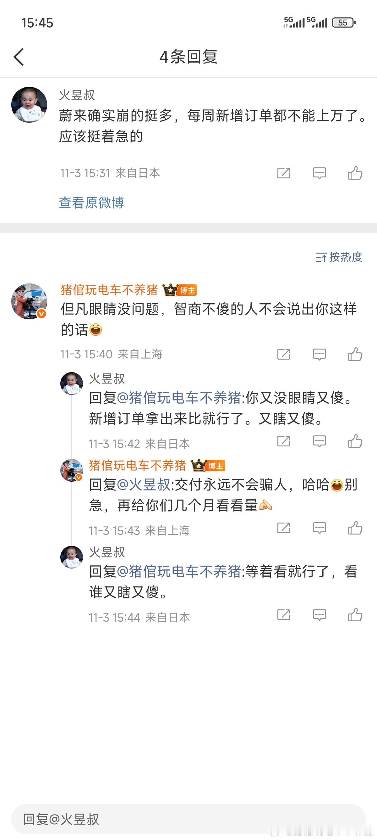 再者说,我原博上也没说哪家啊,你自己站出来黑蔚来,急什么[哈哈]