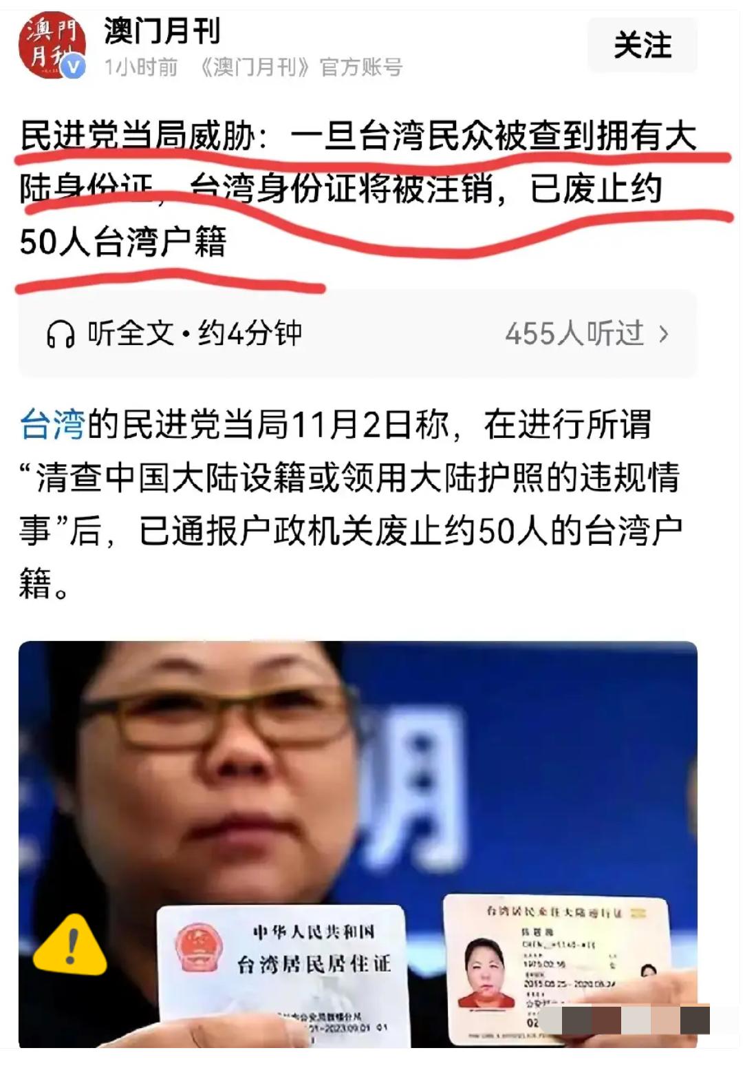 大陆用一个身份证就把民进党吓得如临大敌! 50人因为拥有大陆身份证,被注销台湾户籍。向大陆私信举报材料,还有可能面临7年以上的刑罚。 大陆近几日开通了同胞在大陆申请身份证的功能,这个功能一出,许多人就迫不及待地去申请,尤其是台胞。 去申请这个身份证干什么呢?当然是方便啦!在两岸交流、工作、生活、行使权利方面都方便,甚至在一些大陆城市创业也会更方便。 民进党心里最清楚,台胞去大陆申请身份证,支持台统的势必增加,这让民进党寝食难安。 于是民进党又开始“疯狂作死”了:注销50人户籍,威胁50人中有人向大陆举报的,走漏风声、泄密的,必然受到“法律制裁”,刑期7年以上。 民进党想用“恐吓、威胁”的手,让人民放弃申请身份证,让人民怕坐牢而放弃支持台统,民进党想得美美的,以为这样就能稳住政权,不让这些人支持台统。 但是民进党的这种做法,将加剧两岸人民的矛盾,将侵犯人权,将阻碍两岸交流,必然遭到人民的唾弃和审判!