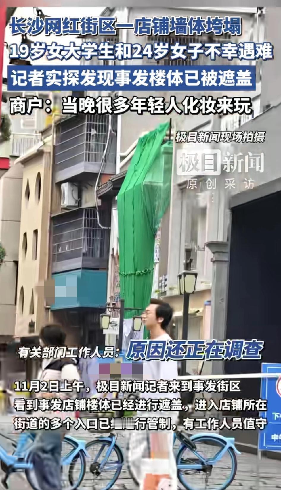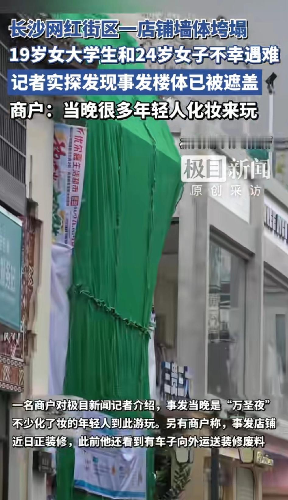 “好可惜啊!”湖南长沙,网红街区一店铺墙体倒塌 ,结果导致19岁大学生和24岁的女子不幸遇难 。 倒塌店铺正在装修 ,临时搭建的脚手架局部倒塌 。四名伤者被救出,其中的两名不幸遇难 。当天是万圣夜,有人打扮穿着服装来此游玩 。没想到会发生这样的事情 。 大家出门在外一定要注意安全,观察周围环境 。避免意外的发生 。