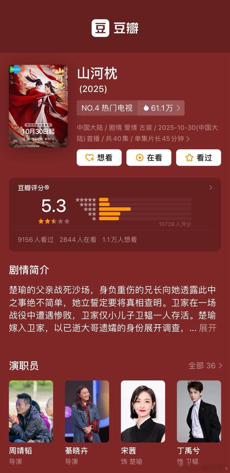 宋茜、丁禹兮山河枕豆瓣开分5.3 评分人数1.07万;高了低了?