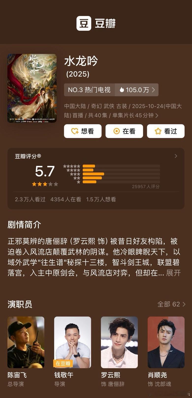 罗云熙水龙吟豆瓣开分5.7 评分人数2.6w